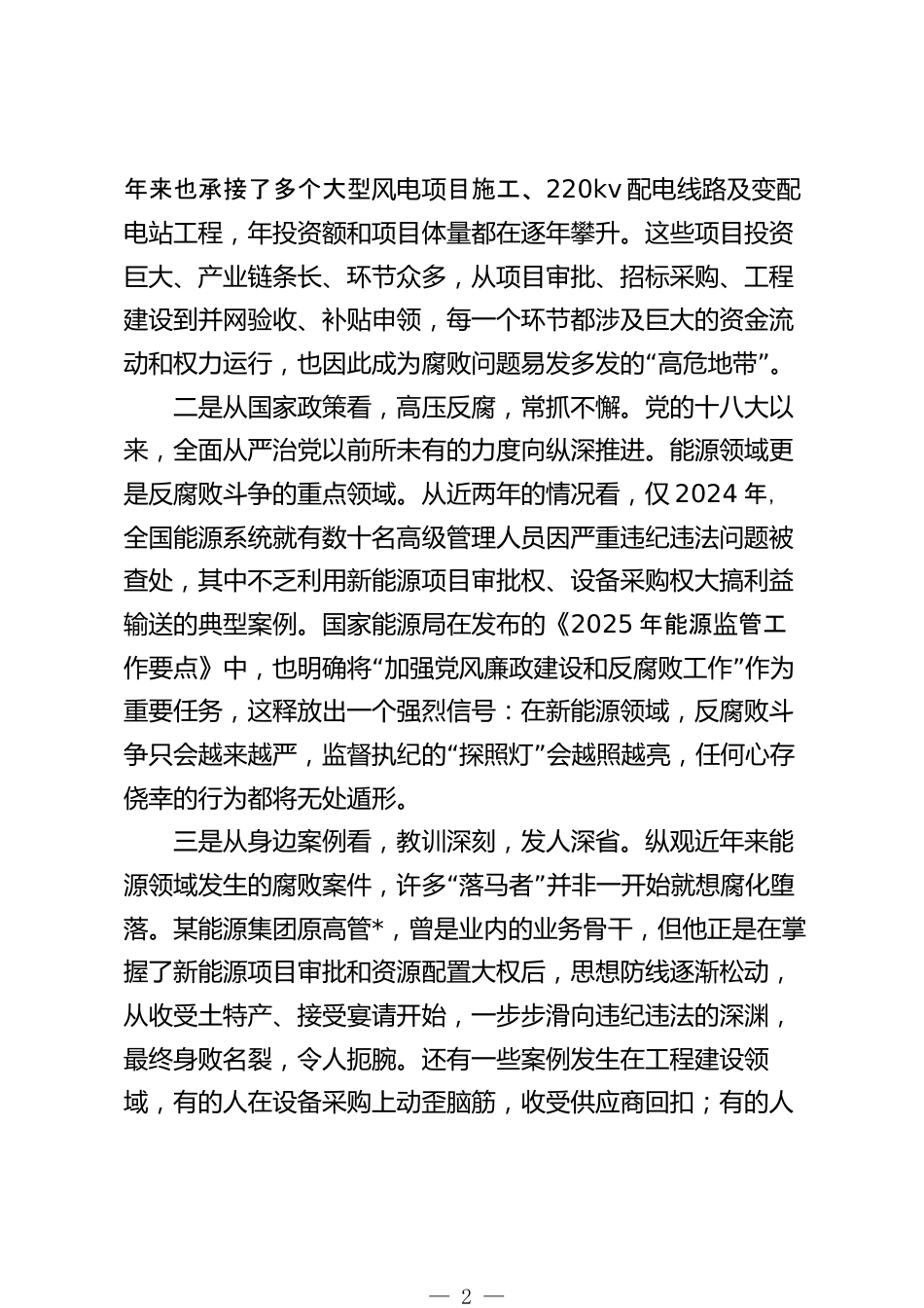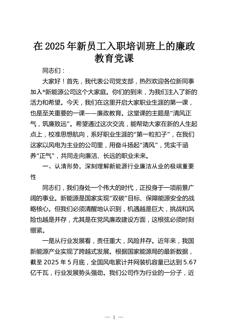 在2025年新員工入職培訓(xùn)班上的廉政教育黨課同志們:大家好!首先,我代表公司黨支部,熱烈歡迎各位新同事加入*新能源公司這個(gè)大家庭。你們的到來(lái),為我們注入了新的活力和希望。今天,我們?cè)谶@里開啟大家職業(yè)生涯的第一課,——“也是至關(guān)重要的一課廉政教育。這堂課的主題是清風(fēng)正”氣,筑廉致遠(yuǎn)。希望通過(guò)這次交流,能幫助大家在新的人生起“”點(diǎn)上,校準(zhǔn)思想航向,系好職業(yè)生涯的第一??圩?,在我們“”這家以風(fēng)電為主業(yè)的公司里,用奮斗揚(yáng)起清風(fēng),憑實(shí)干涵“”養(yǎng)正氣,共同走向廉潔、長(zhǎng)遠(yuǎn)的職業(yè)未來(lái)。一、認(rèn)清形勢(shì),深刻理解新能源行業(yè)廉潔從業(yè)的極端重要性同志們,...