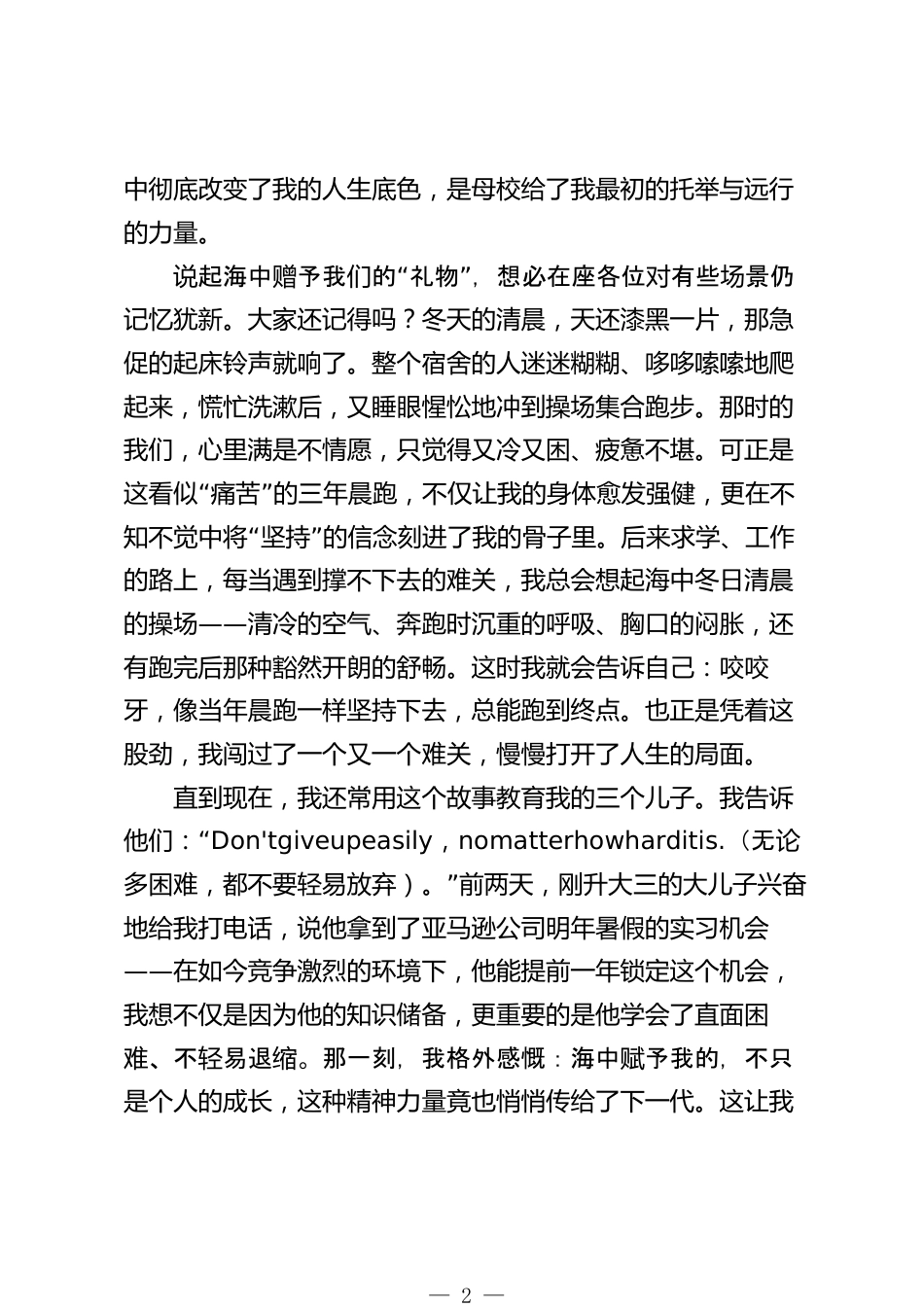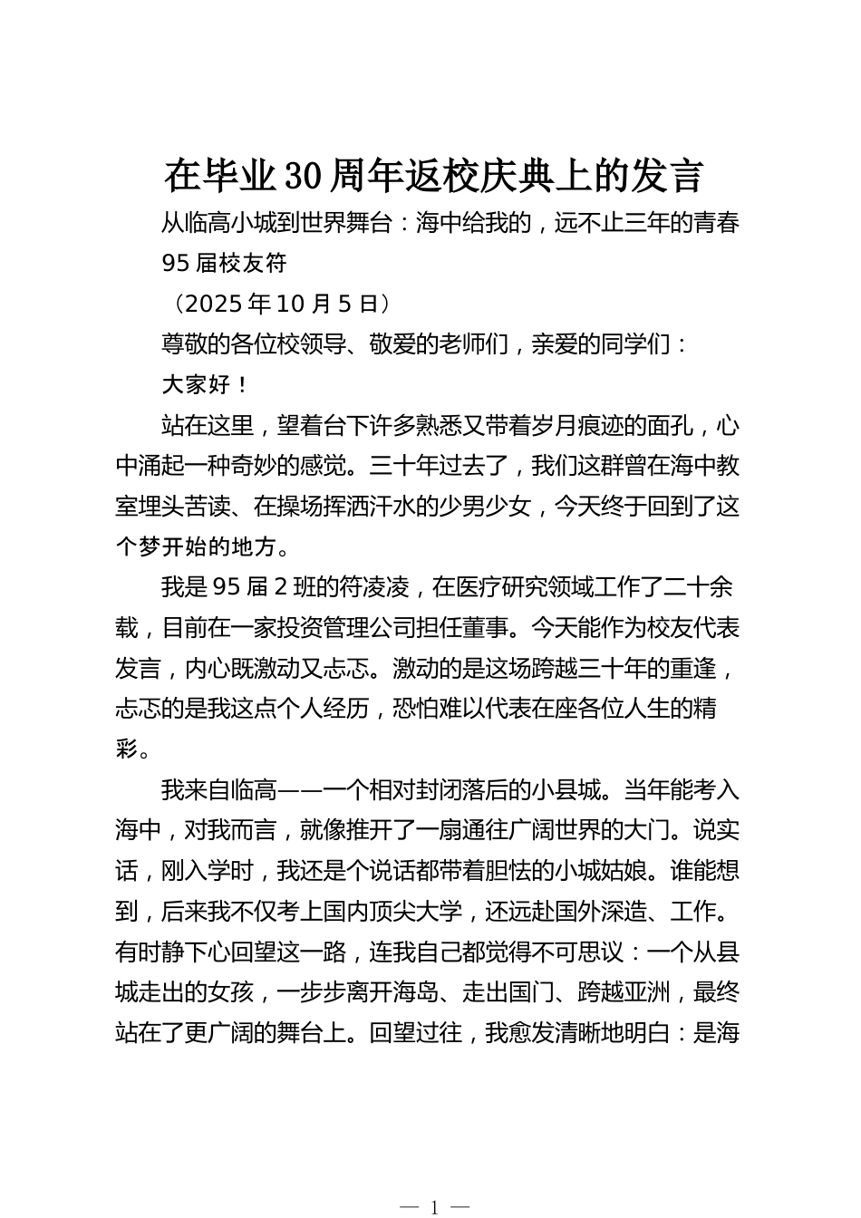 在畢業(yè)30周年返校慶典上的發(fā)言從臨高小城到世界舞臺:海中給我的,遠(yuǎn)不止三年的青春95屆校友符(2025年10月5日)尊敬的各位校領(lǐng)導(dǎo)、敬愛的老師們,親愛的同學(xué)們:大家好!站在這里,望著臺下許多熟悉又帶著歲月痕跡的面孔,心中涌起一種奇妙的感覺。三十年過去了,我們這群曾在海中教室埋頭苦讀、在操場揮灑汗水的少男少女,今天終于回到了這個夢開始的地方。我是95屆2班的符凌凌,在醫(yī)療研究領(lǐng)域工作了二十余載,目前在一家投資管理公司擔(dān)任董事。今天能作為校友代表發(fā)言,內(nèi)心既激動又忐忑。激動的是這場跨越三十年的重逢,忐忑的是我這點(diǎn)個人經(jīng)歷,恐怕難以代表在座各...