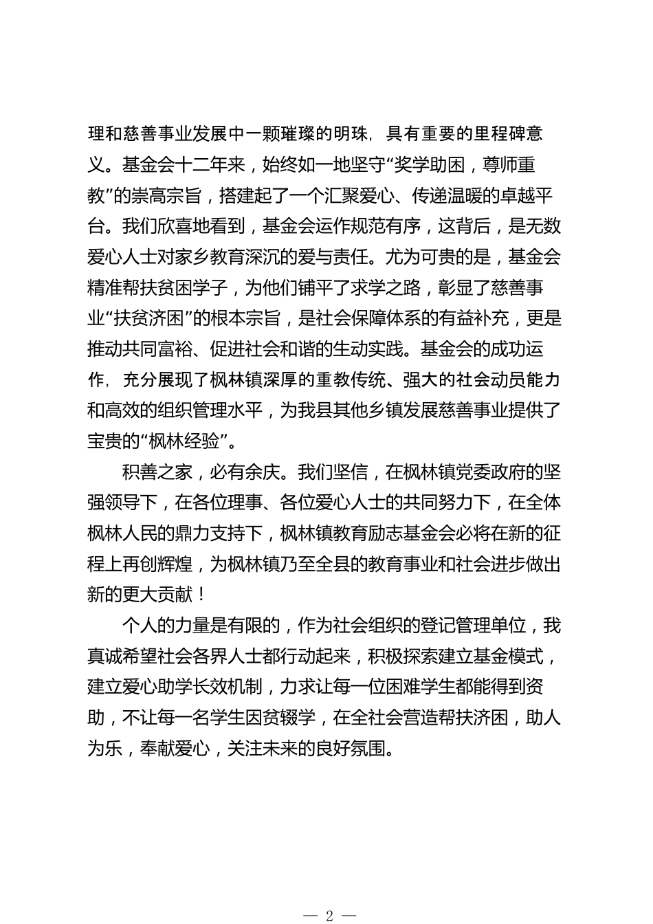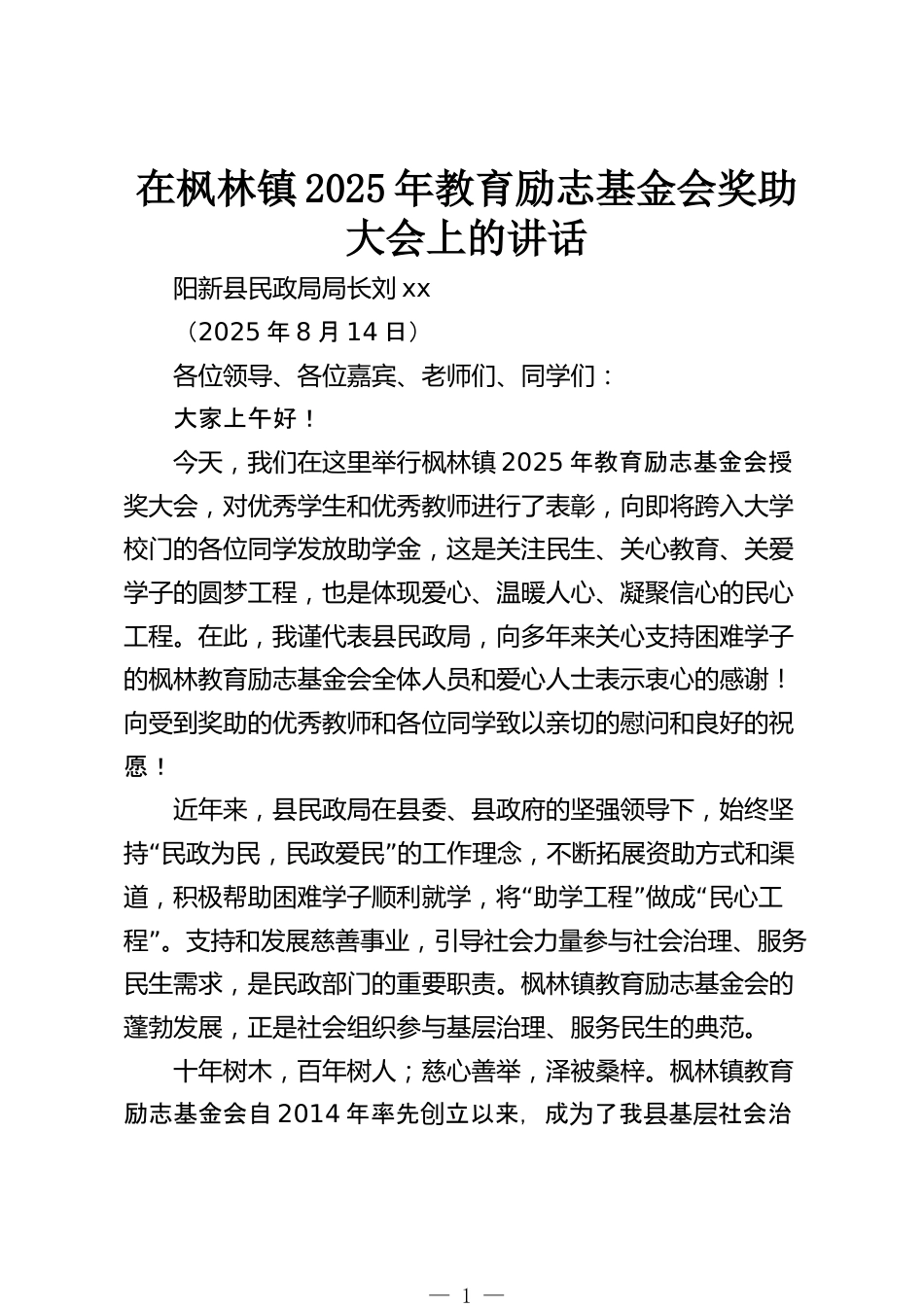 在楓林鎮(zhèn)2025年教育勵(lì)志基金會(huì)獎(jiǎng)助大會(huì)上的講話陽新縣民政局局長劉xx(2025年8月14日)各位領(lǐng)導(dǎo)、各位嘉賓、老師們、同學(xué)們:大家上午好!今天,我們?cè)谶@里舉行楓林鎮(zhèn)2025年教育勵(lì)志基金會(huì)授獎(jiǎng)大會(huì),對(duì)優(yōu)秀學(xué)生和優(yōu)秀教師進(jìn)行了表彰,向即將跨入大學(xué)校門的各位同學(xué)發(fā)放助學(xué)金,這是關(guān)注民生、關(guān)心教育、關(guān)愛學(xué)子的圓夢(mèng)工程,也是體現(xiàn)愛心、溫暖人心、凝聚信心的民心工程。在此,我謹(jǐn)代表縣民政局,向多年來關(guān)心支持困難學(xué)子的楓林教育勵(lì)志基金會(huì)全體人員和愛心人士表示衷心的感謝!向受到獎(jiǎng)助的優(yōu)秀教師和各位同學(xué)致以親切的慰問和良好的祝愿!近年來,縣民政局在縣委、...