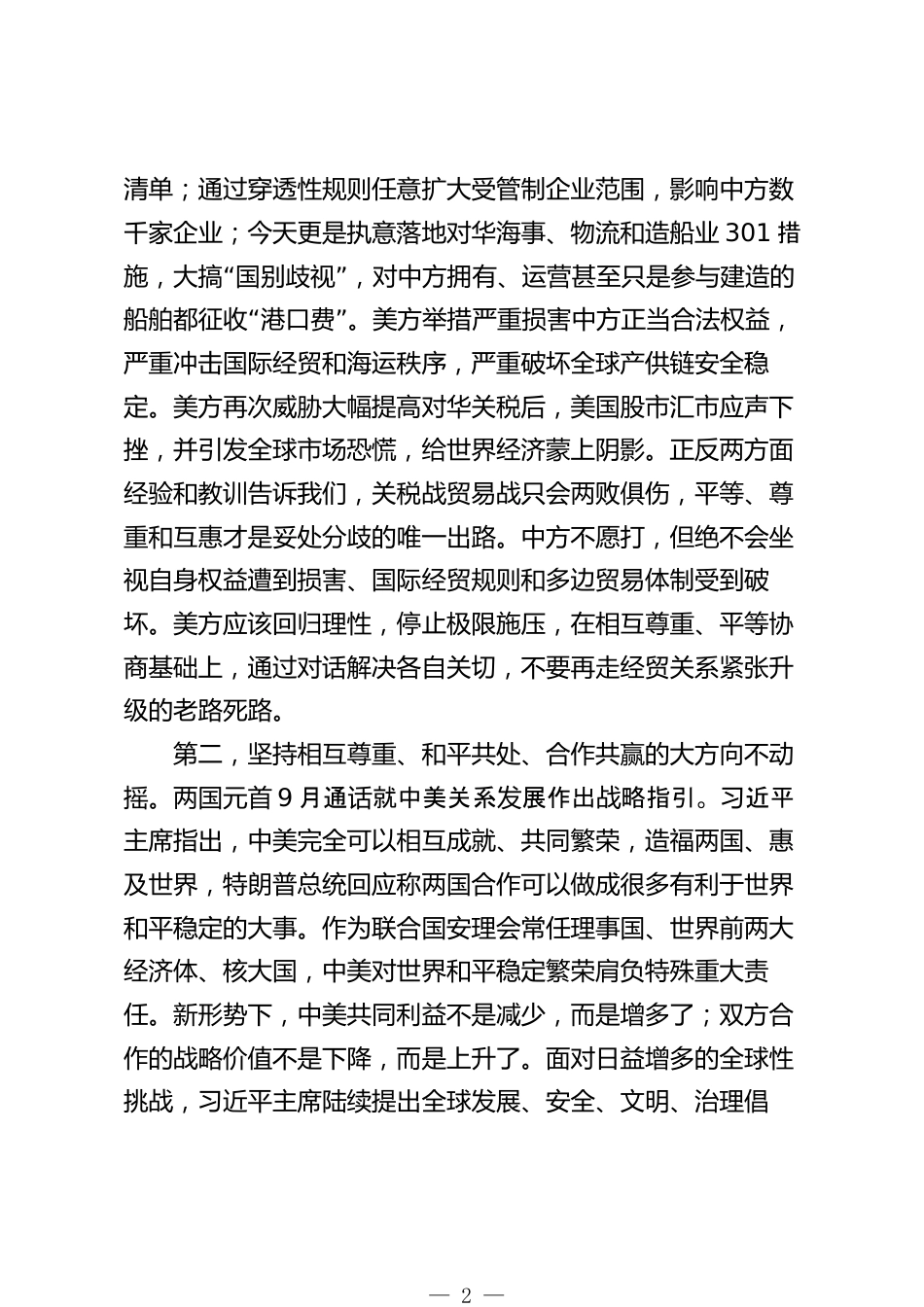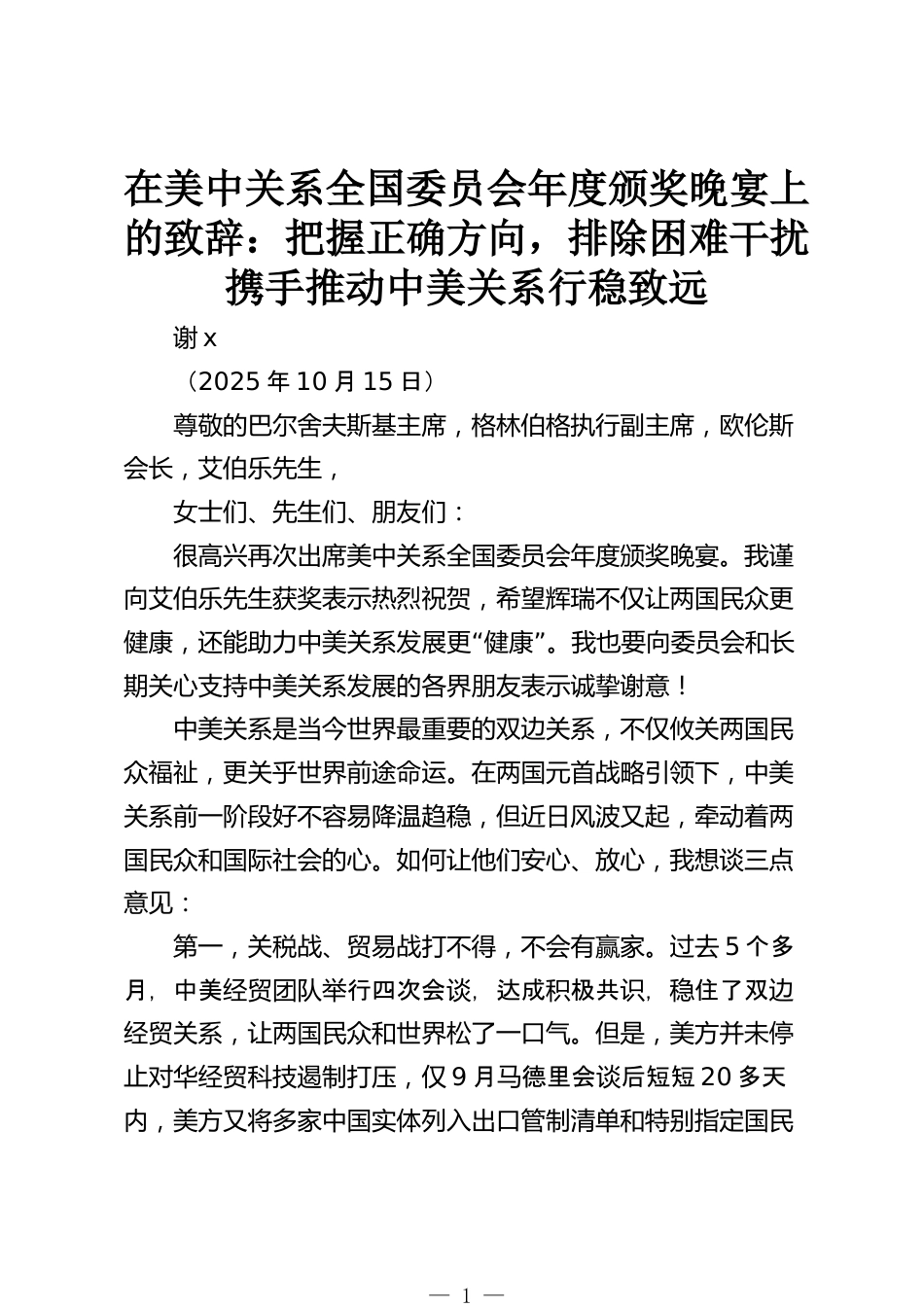 在美中關(guān)系全國委員會年度頒獎晚宴上的致辭:把握正確方向,排除困難干擾攜手推動中美關(guān)系行穩(wěn)致遠(yuǎn)謝x(2025年10月15日)尊敬的巴爾舍夫斯基主席,格林伯格執(zhí)行副主席,歐倫斯會長,艾伯樂先生,女士們、先生們、朋友們:很高興再次出席美中關(guān)系全國委員會年度頒獎晚宴。我謹(jǐn)向艾伯樂先生獲獎表示熱烈祝賀,希望輝瑞不僅讓兩國民眾更“”健康,還能助力中美關(guān)系發(fā)展更健康。我也要向委員會和長期關(guān)心支持中美關(guān)系發(fā)展的各界朋友表示誠摯謝意!中美關(guān)系是當(dāng)今世界最重要的雙邊關(guān)系,不僅攸關(guān)兩國民眾福祉,更關(guān)乎世界前途命運(yùn)。在兩國元首戰(zhàn)略引領(lǐng)下,中美關(guān)系前一階段好...