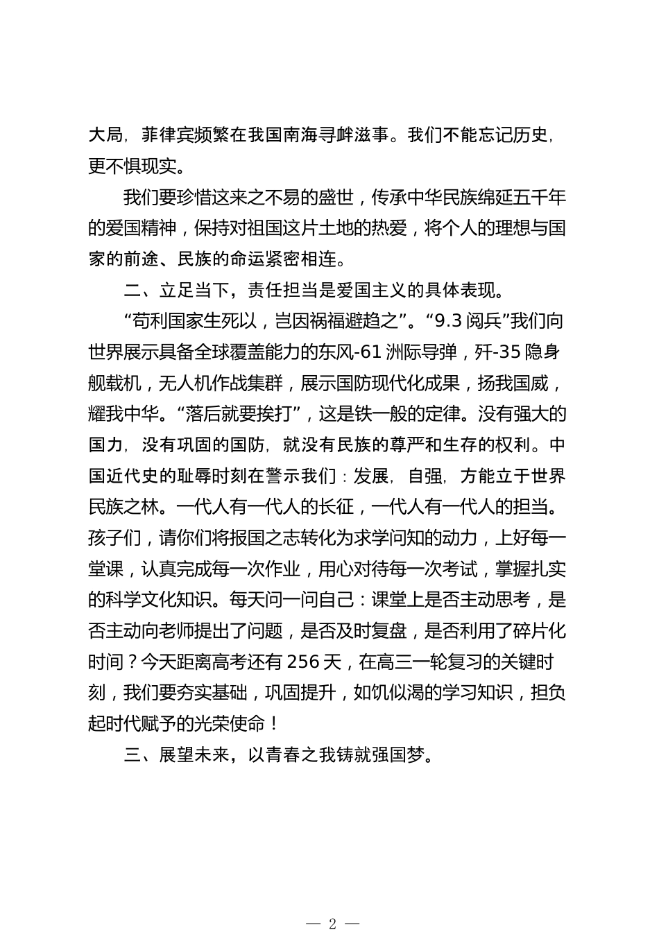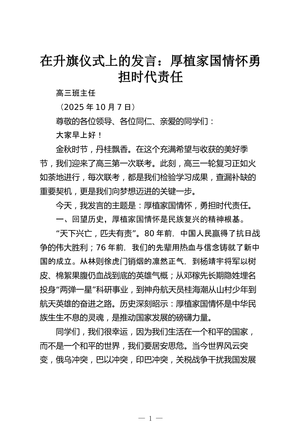 在升旗儀式上的發(fā)言:厚植家國(guó)情懷勇?lián)鷷r(shí)代責(zé)任高三班主任(2025年10月7日)尊敬的各位領(lǐng)導(dǎo)、各位同仁、親愛的同學(xué)們:大家早上好!金秋時(shí)節(jié),丹桂飄香。在這個(gè)充滿希望與收獲的美好季節(jié),我們迎來了高三第一次聯(lián)考。此刻,高三一輪復(fù)習(xí)正如火如荼地進(jìn)行,每次聯(lián)考,都是我們檢驗(yàn)學(xué)習(xí)成果,查漏補(bǔ)缺的重要契機(jī),更是我們向夢(mèng)想邁進(jìn)的關(guān)鍵一步。今天,我發(fā)言的主題是:厚植家國(guó)情懷,勇?lián)鷷r(shí)代責(zé)任。一、回望歷史,厚植家國(guó)情懷是民族復(fù)興的精神根基?!啊碧煜屡d亡,匹夫有責(zé)。80年前,中國(guó)人民贏得了抗日戰(zhàn)爭(zhēng)的偉大勝利;76年前,我的先用血與信念就了新中們輩熱鑄國(guó)的成...