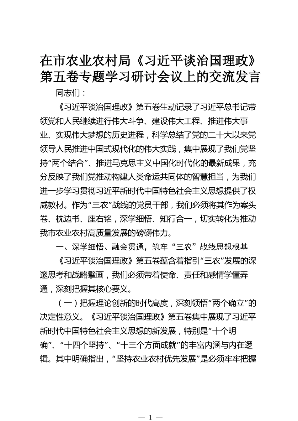 在市農(nóng)業(yè)農(nóng)村局《習(xí)近平談治國理政》第五卷專題學(xué)習(xí)研討會(huì)議上的交流發(fā)言