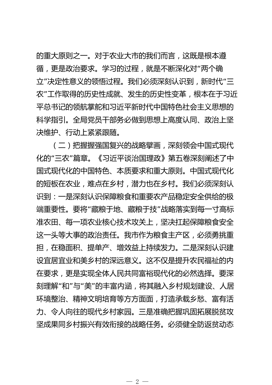 在市農(nóng)業(yè)農(nóng)村局《習(xí)近平談治國理政》第五卷專題學(xué)習(xí)研討會(huì)議上的交流發(fā)言同志們:《習(xí)近平談治國理政》第五卷生動(dòng)記錄了習(xí)近平總書記帶領(lǐng)黨和人民繼續(xù)進(jìn)行偉大斗爭、建設(shè)偉大工程、推進(jìn)偉大事業(yè)、實(shí)現(xiàn)偉大夢想的歷史進(jìn)程,科學(xué)總結(jié)了黨的二十大以來黨領(lǐng)導(dǎo)人民推進(jìn)中國式現(xiàn)代化的偉大實(shí)踐,集中展現(xiàn)了我們黨堅(jiān)“”持兩個(gè)結(jié)合、推進(jìn)馬克思主義中國化時(shí)代化的最新成果,充分反映了我們黨推動(dòng)構(gòu)建人類命運(yùn)共同體的智慧擔(dān)當(dāng),為我們進(jìn)一步學(xué)習(xí)貫徹習(xí)近平新時(shí)代中國特色社會(huì)主義思想提供了權(quán)“”威教材。作為三農(nóng)戰(zhàn)線的黨員干部,我們必須將其作為案頭卷、枕邊書、座右銘,深學(xué)...
