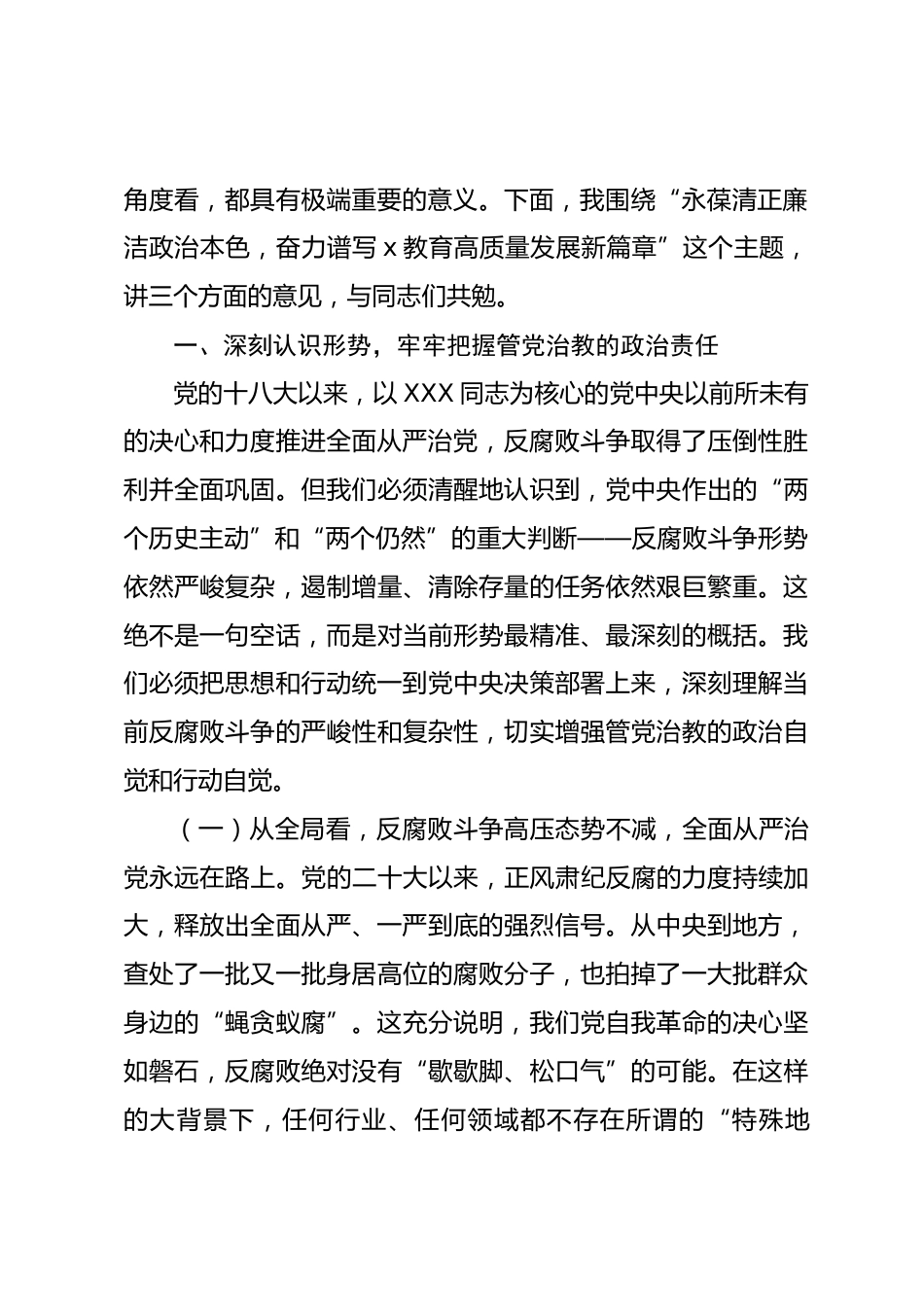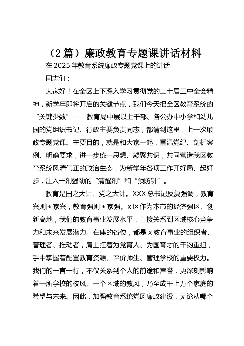 (2篇)廉政教育專題課講話材料在2025年教育系統(tǒng)廉政專題黨課上的講話同志們:大家好!在全區(qū)上下深入學(xué)習(xí)貫徹黨的二十屆三中全會(huì)精神,新學(xué)年即將開(kāi)啟的關(guān)鍵節(jié)點(diǎn),我們今天把全區(qū)教育系統(tǒng)的“關(guān)鍵少數(shù)”——教育局中層以上干部、各公辦中小學(xué)和幼兒園的黨組織書記、行政主要負(fù)責(zé)同志,都請(qǐng)到這里,上一次廉政專題黨課。主要目的,就是和大家一起,重溫黨紀(jì)、剖析案例、明確要求,進(jìn)一步統(tǒng)一思想、凝聚共識(shí),共同營(yíng)造我區(qū)教育系統(tǒng)風(fēng)清氣正的政治生態(tài),為新學(xué)年各項(xiàng)工作開(kāi)好局、起好步,注入一劑強(qiáng)勁的“清醒劑”和“預(yù)防針”。教育是國(guó)之大計(jì)、黨之大計(jì)。XXX總書記反復(fù)強(qiáng)...