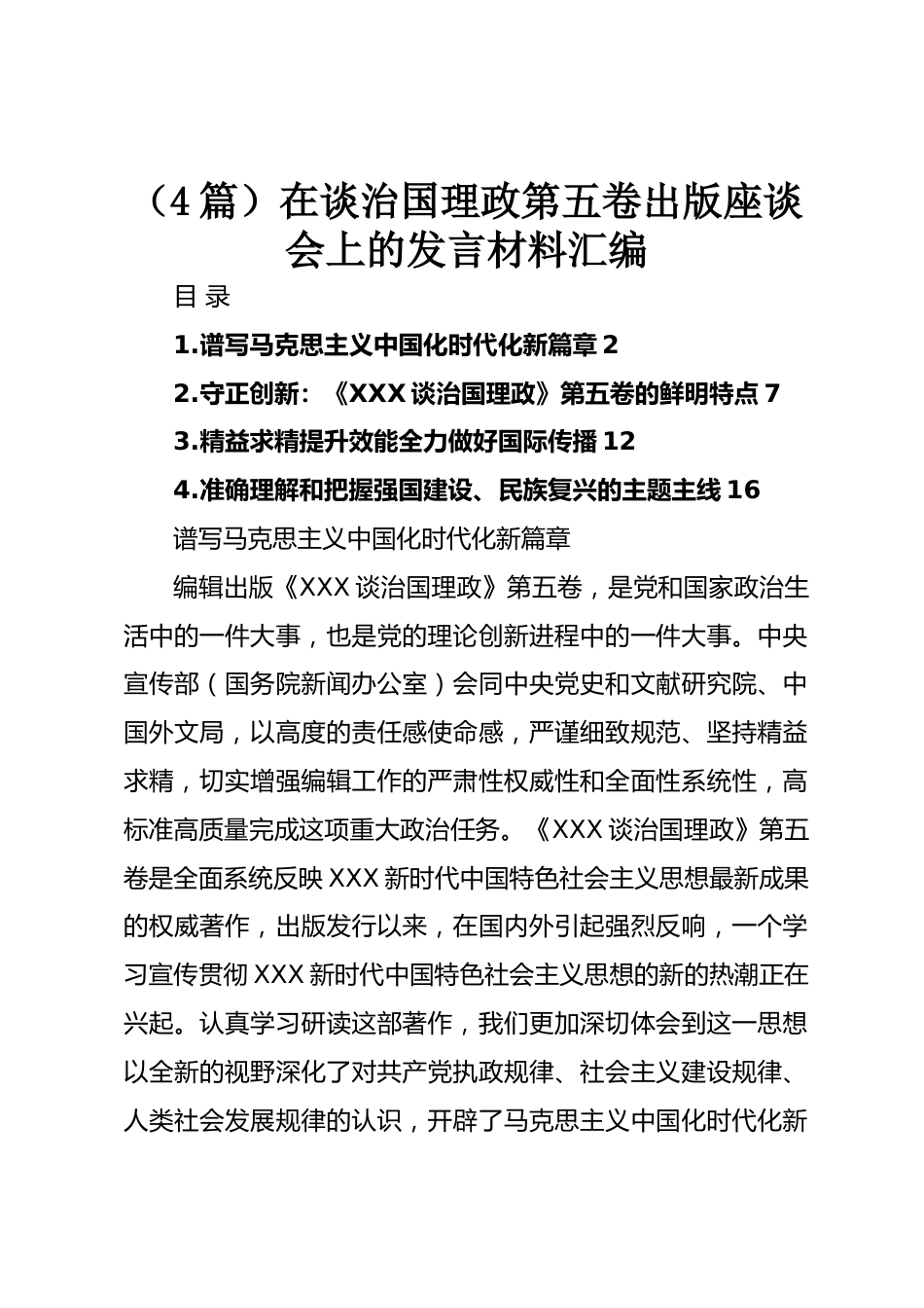 (4篇)在談治國(guó)理政第五卷出版座談會(huì)上的發(fā)言材料匯編目錄1.譜寫(xiě)馬克思主義中國(guó)化時(shí)代化新篇章22.守正創(chuàng)新:《XXX談治國(guó)理政》第五卷的鮮明特點(diǎn)73.精益求精提升效能全力做好國(guó)際傳播124.準(zhǔn)確理解和把握強(qiáng)國(guó)建設(shè)、民族復(fù)興的主題主線(xiàn)16譜寫(xiě)馬克思主義中國(guó)化時(shí)代化新篇章編輯出版《XXX談治國(guó)理政》第五卷,是黨和國(guó)家政治生活中的一件大事,也是黨的理論創(chuàng)新進(jìn)程中的一件大事。中央宣傳部(國(guó)務(wù)院新聞辦公室)會(huì)同中央黨史和文獻(xiàn)研究院、中國(guó)外文局,以高度的責(zé)任感使命感,嚴(yán)謹(jǐn)細(xì)致規(guī)范、堅(jiān)持精益求精,切實(shí)增強(qiáng)編輯工作的嚴(yán)肅性權(quán)威性和全面性系統(tǒng)性,高標(biāo)準(zhǔn)高質(zhì)量完成...