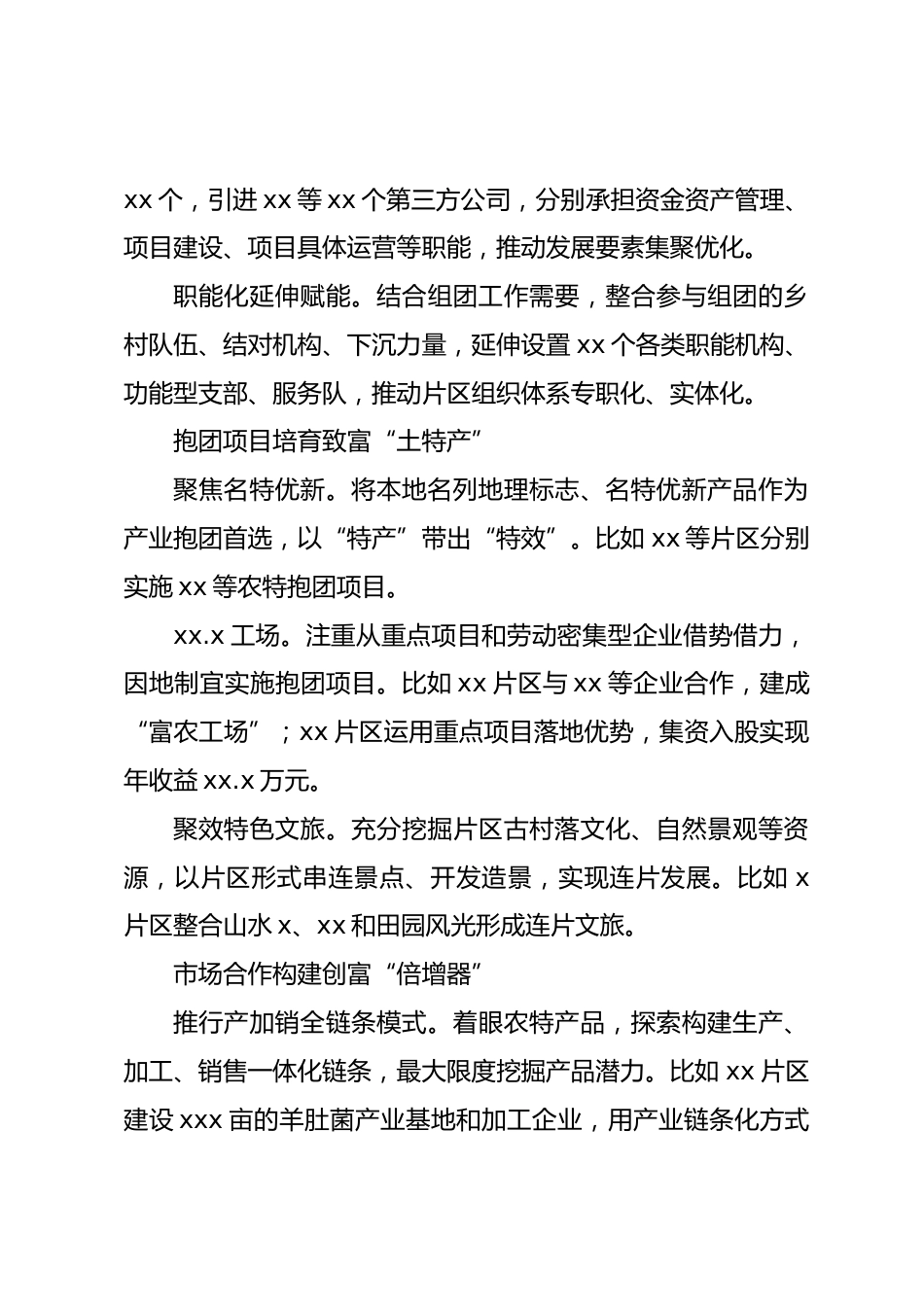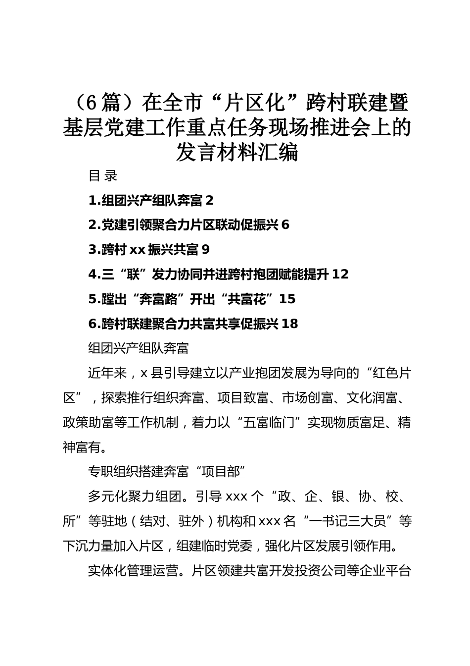 (6篇)在全市“片區(qū)化”跨村聯(lián)建暨基層黨建工作重點(diǎn)任務(wù)現(xiàn)場(chǎng)推進(jìn)會(huì)上的發(fā)言材料匯編目錄1.組團(tuán)興產(chǎn)組隊(duì)奔富22.黨建引領(lǐng)聚合力片區(qū)聯(lián)動(dòng)促振興63.跨村xx振興共富94.三“聯(lián)”發(fā)力協(xié)同并進(jìn)跨村抱團(tuán)賦能提升125.蹚出“奔富路”開出“共富花”156.跨村聯(lián)建聚合力共富共享促振興18組團(tuán)興產(chǎn)組隊(duì)奔富近年來(lái),x縣引導(dǎo)建立以產(chǎn)業(yè)抱團(tuán)發(fā)展為導(dǎo)向的“紅色片區(qū)”,探索推行組織奔富、項(xiàng)目致富、市場(chǎng)創(chuàng)富、文化潤(rùn)富、政策助富等工作機(jī)制,著力以“五富臨門”實(shí)現(xiàn)物質(zhì)富足、精神富有。專職組織搭建奔富“項(xiàng)目部”多元化聚力組團(tuán)。引導(dǎo)xxx個(gè)“政、企、銀、協(xié)、校、所”等駐地(結(jié)對(duì)、駐外...