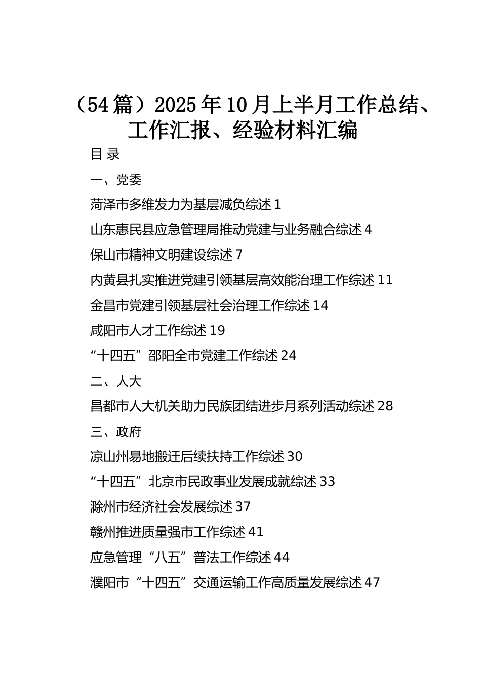 (54篇)2025年10月上半月工作總結(jié)、工作匯報(bào)、經(jīng)驗(yàn)材料匯編目錄一、黨委菏澤市多維發(fā)力為基層減負(fù)綜述1山東惠民縣應(yīng)急管理局推動(dòng)黨建與業(yè)務(wù)融合綜述4保山市精神文明建設(shè)綜述7內(nèi)黃縣扎實(shí)推進(jìn)黨建引領(lǐng)基層高效能治理工作綜述11金昌市黨建引領(lǐng)基層社會(huì)治理工作綜述14咸陽市人才工作綜述19“十四五”邵陽全市黨建工作綜述24二、人大昌都市人大機(jī)關(guān)助力民族團(tuán)結(jié)進(jìn)步月系列活動(dòng)綜述28三、政府涼山州易地搬遷后續(xù)扶持工作綜述30“十四五”北京市民政事業(yè)發(fā)展成就綜述33滁州市經(jīng)濟(jì)社會(huì)發(fā)展綜述37贛州推進(jìn)質(zhì)量強(qiáng)市工作綜述41應(yīng)急管理“八五”普法工作綜述44濮陽市“十四五”交通...