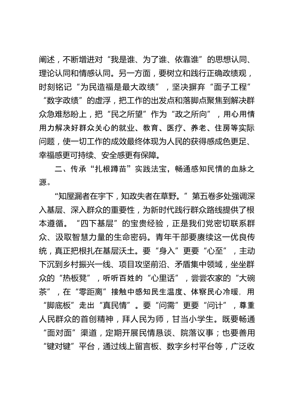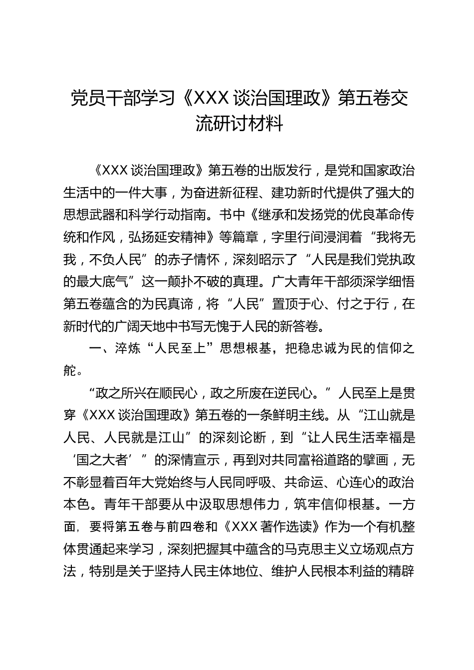黨員干部學(xué)習(xí)《XXX談治國理政》第五卷交流研討材料《XXX談治國理政》第五卷的出版發(fā)行,是黨和國家政治生活中的一件大事,為奮進(jìn)新征程、建功新時(shí)代提供了強(qiáng)大的思想武器和科學(xué)行動(dòng)指南。書中《繼承和發(fā)揚(yáng)黨的優(yōu)良革命傳統(tǒng)和作風(fēng),弘揚(yáng)延安精神》等篇章,字里行間浸潤著“我將無我,不負(fù)人民”的赤子情懷,深刻昭示了“人民是我們黨執(zhí)政的最大底氣”這一顛撲不破的真理。廣大青年干部須深學(xué)細(xì)悟第五卷蘊(yùn)含的為民真諦,將“人民”置頂于心、付之于行,在新時(shí)代的廣闊天地中書寫無愧于人民的新答卷。一、淬煉“人民至上”思想根基,把穩(wěn)忠誠為民的信仰之舵。“政之所興在順...