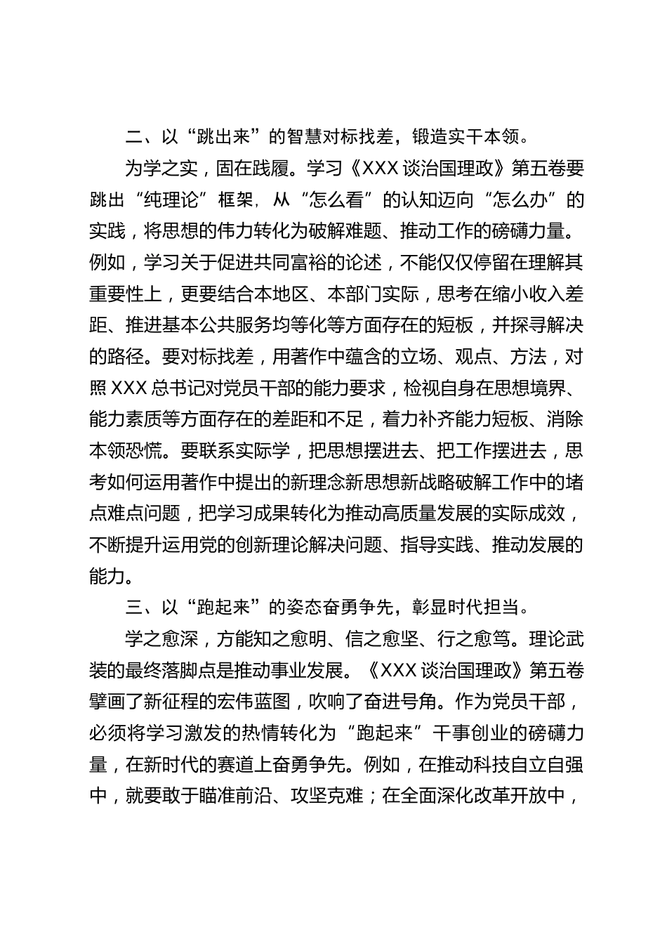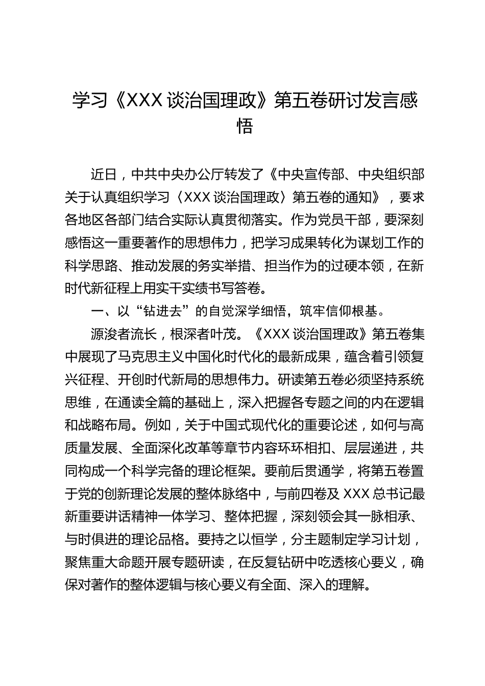 學(xué)習(xí)《XXX談治國理政》第五卷研討發(fā)言感悟近日,中共中央辦公廳轉(zhuǎn)發(fā)了《中央宣傳部、中央組織部關(guān)于認(rèn)真組織學(xué)習(xí)〈XXX談治國理政〉第五卷的通知》,要求各地區(qū)各部門結(jié)合實(shí)際認(rèn)真貫徹落實(shí)。作為黨員干部,要深刻感悟這一重要著作的思想偉力,把學(xué)習(xí)成果轉(zhuǎn)化為謀劃工作的科學(xué)思路、推動發(fā)展的務(wù)實(shí)舉措、擔(dān)當(dāng)作為的過硬本領(lǐng),在新時代新征程上用實(shí)干實(shí)績書寫答卷。一、以“鉆進(jìn)去”的自覺深學(xué)細(xì)悟,筑牢信仰根基。源浚者流長,根深者葉茂?!禭XX談治國理政》第五卷集中展現(xiàn)了馬克思主義中國化時代化的最新成果,蘊(yùn)含著引領(lǐng)復(fù)興征程、開創(chuàng)時代新局的思想偉力。研讀第五卷必...