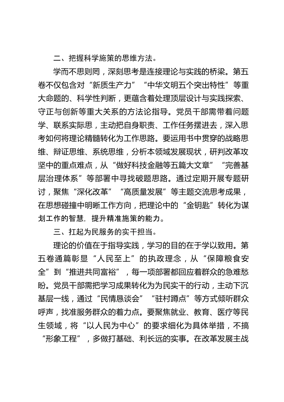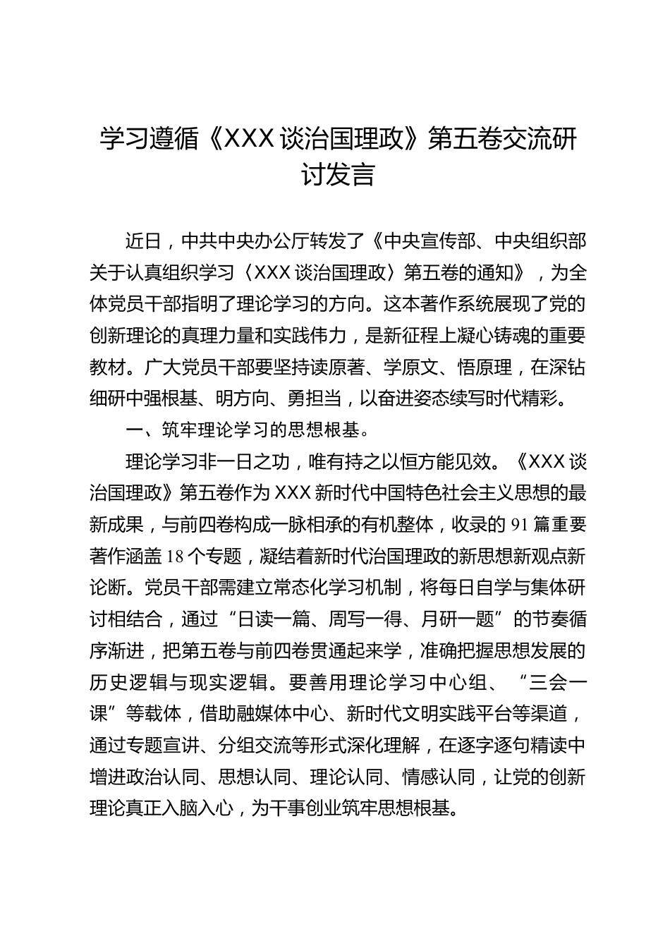 學習遵循《XXX談治國理政》第五卷交流研討發(fā)言近日,中共中央辦公廳轉(zhuǎn)發(fā)了《中央宣傳部、中央組織部關(guān)于認真組織學習〈XXX談治國理政〉第五卷的通知》,為全體黨員干部指明了理論學習的方向。這本著作系統(tǒng)展現(xiàn)了黨的創(chuàng)新理論的真理力量和實踐偉力,是新征程上凝心鑄魂的重要教材。廣大黨員干部要堅持讀原著、學原文、悟原理,在深鉆細研中強根基、明方向、勇?lián)?,以奮進姿態(tài)續(xù)寫時代精彩。一、筑牢理論學習的思想根基。理論學習非一日之功,唯有持之以恒方能見效?!禭XX談治國理政》第五卷作為XXX新時代中國特色社會主義思想的最新成果,與前四卷構(gòu)成一脈相承的有機整體...