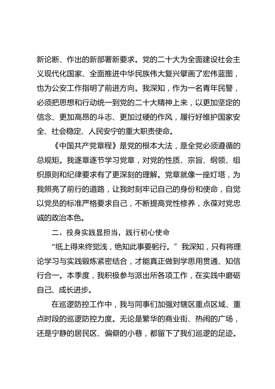 2025年第一季度青年民警入黨積極分子思想匯報尊敬的黨組織:時光飛逝,如白駒過隙,2025年的第一季度已然結束。在這個充滿生機與希望的季節(jié)里,作為一名懷揣著赤誠之心向黨組織靠攏的青年民警,我始終以黨的旗幟為旗幟、以黨的方向為方向、以黨的意志為意志,堅持不懈地學習黨的理論知識,積極投身派出所各項工作實踐,力求在思想和行動上與黨組織保持高度一致?,F(xiàn)將本季度的思想動態(tài)和工作情況向黨組織匯報如下:一、深學理論強根基,鑄牢忠誠警魂理論上的清醒是政治上堅定的前提。本季度,我將學習XXX新時代中國特色社會主義思想作為首要政治任務,深入研讀《XXX談治國...
