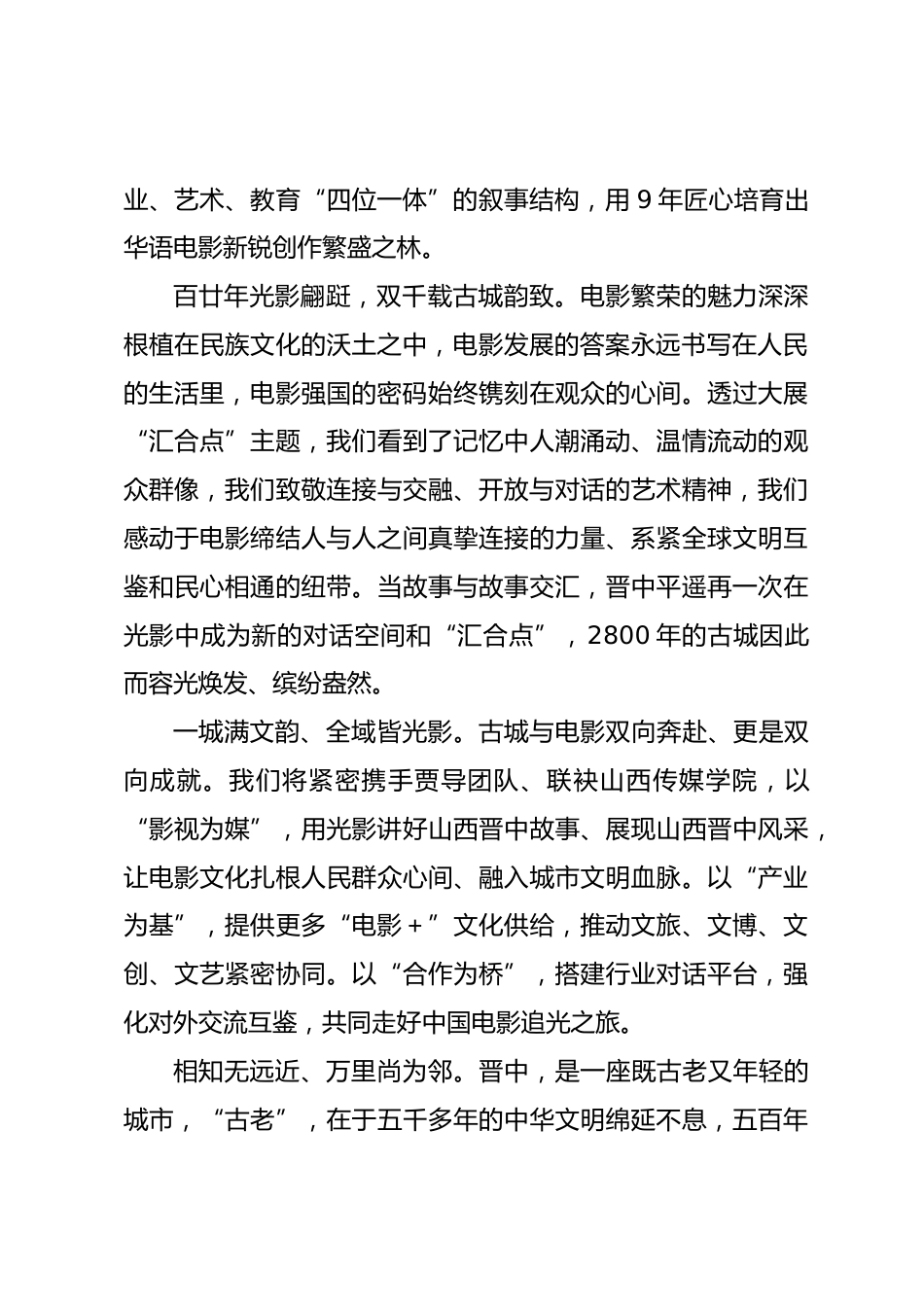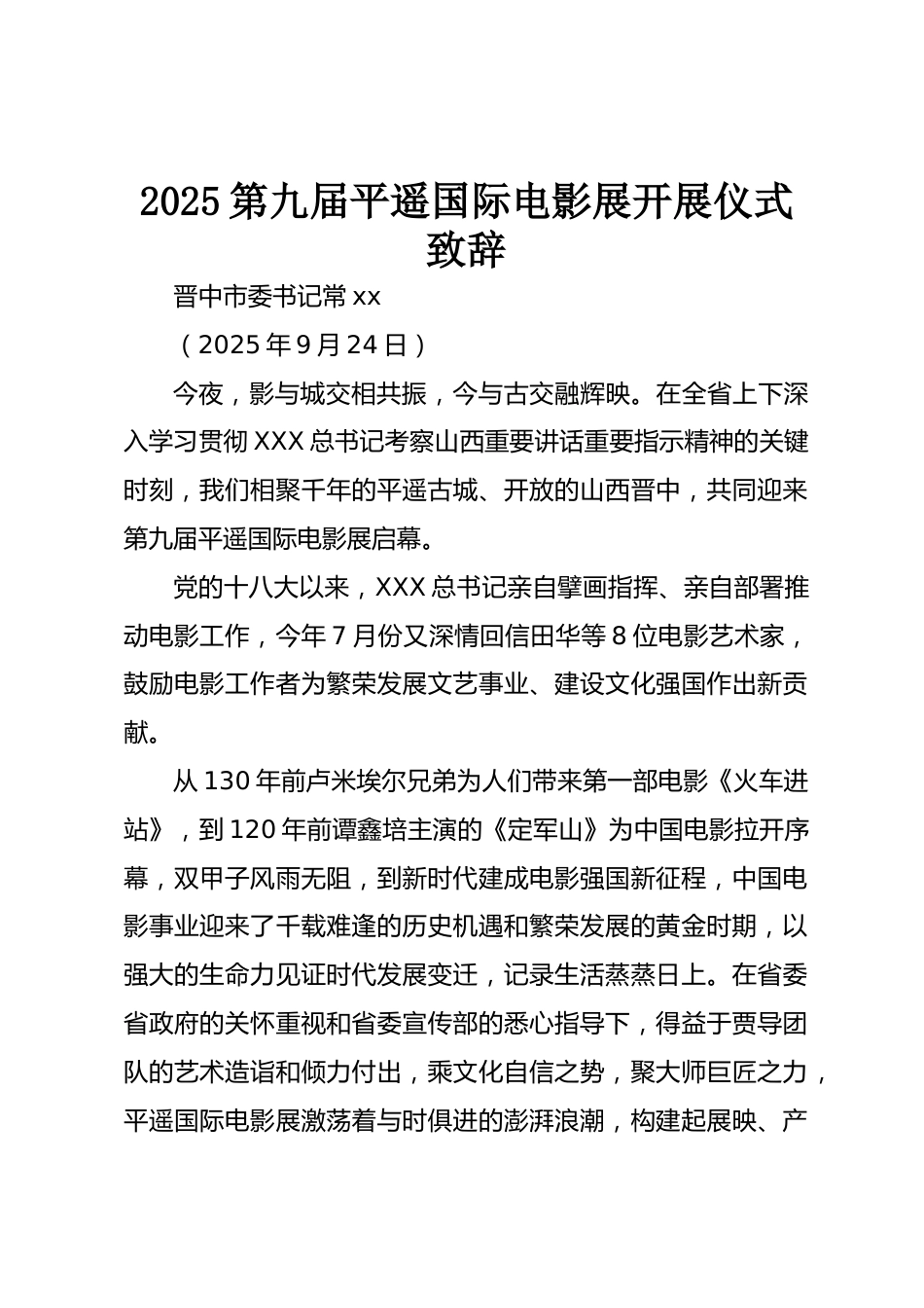 2025第九屆平遙國際電影展開展儀式致辭晉中市委書記常xx(2025年9月24日)今夜,影與城交相共振,今與古交融輝映。在全省上下深入學(xué)習(xí)貫徹XXX總書記考察山西重要講話重要指示精神的關(guān)鍵時刻,我們相聚千年的平遙古城、開放的山西晉中,共同迎來第九屆平遙國際電影展啟幕。黨的十八大以來,XXX總書記親自擘畫指揮、親自部署推動電影工作,今年7月份又深情回信田華等8位電影藝術(shù)家,鼓勵電影工作者為繁榮發(fā)展文藝事業(yè)、建設(shè)文化強(qiáng)國作出新貢獻(xiàn)。從130年前盧米埃爾兄弟為人們帶來第一部電影《火車進(jìn)站》,到120年前譚鑫培主演的《定軍山》為中國電影拉開序幕,雙甲子風(fēng)雨無...