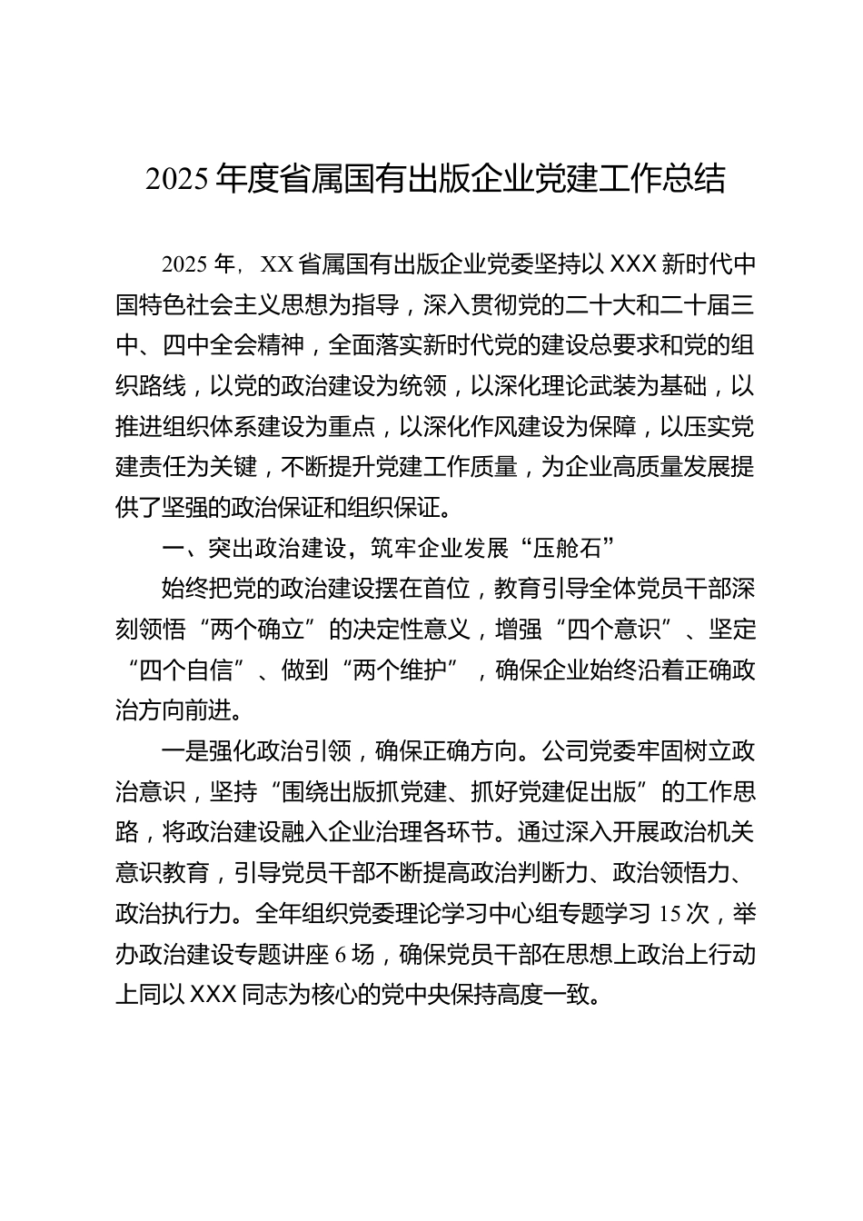 2025年度省屬?lài)?guó)有出版企業(yè)黨建工作總結(jié)2025年,XX省屬?lài)?guó)有出版企業(yè)黨委堅(jiān)持以XXX新時(shí)代中國(guó)特色社會(huì)主義思想為指導(dǎo),深入貫徹黨的二十大和二十屆三中、四中全會(huì)精神,全面落實(shí)新時(shí)代黨的建設(shè)總要求和黨的組織路線(xiàn),以黨的政治建設(shè)為統(tǒng)領(lǐng),以深化理論武裝為基礎(chǔ),以推進(jìn)組織體系建設(shè)為重點(diǎn),以深化作風(fēng)建設(shè)為保障,以壓實(shí)黨建責(zé)任為關(guān)鍵,不斷提升黨建工作質(zhì)量,為企業(yè)高質(zhì)量發(fā)展提供了堅(jiān)強(qiáng)的政治保證和組織保證。一、突出政治建設(shè),筑牢企業(yè)發(fā)展“壓艙石”始終把黨的政治建設(shè)擺在首位,教育引導(dǎo)全體黨員干部深刻領(lǐng)悟“兩個(gè)確立”的決定性意義,增強(qiáng)“四個(gè)意識(shí)”、堅(jiān)定“...