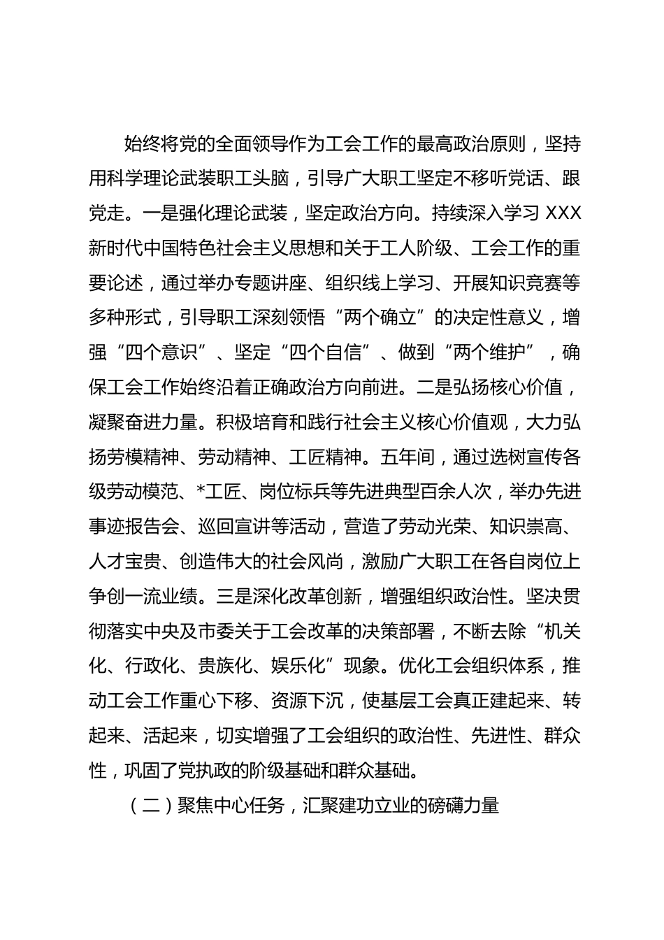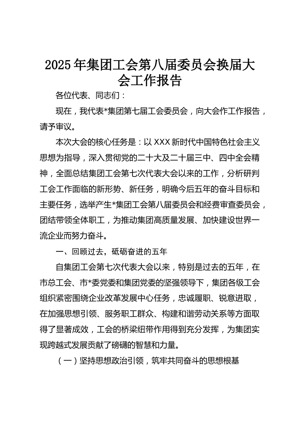 2025年集團(tuán)工會(huì)第八屆委員會(huì)換屆大會(huì)工作報(bào)告各位代表、同志們:現(xiàn)在,我代表*集團(tuán)第七屆工會(huì)委員會(huì),向大會(huì)作工作報(bào)告,請予審議。本次大會(huì)的核心任務(wù)是:以XXX新時(shí)代中國特色社會(huì)主義思想為指導(dǎo),深入貫徹黨的二十大及二十屆三中、四中全會(huì)精神,全面總結(jié)集團(tuán)工會(huì)第七次代表大會(huì)以來的工作,分析研判工會(huì)工作面臨的新形勢、新任務(wù),明確今后五年的奮斗目標(biāo)和主要任務(wù),選舉產(chǎn)生*集團(tuán)工會(huì)第八屆委員會(huì)和經(jīng)費(fèi)審查委員會(huì),團(tuán)結(jié)帶領(lǐng)全體職工,為推動(dòng)集團(tuán)高質(zhì)量發(fā)展、加快建設(shè)世界一流企業(yè)而努力奮斗。一、回顧過去,砥礪奮進(jìn)的五年自集團(tuán)工會(huì)第七次代表大會(huì)以來,特別是過...