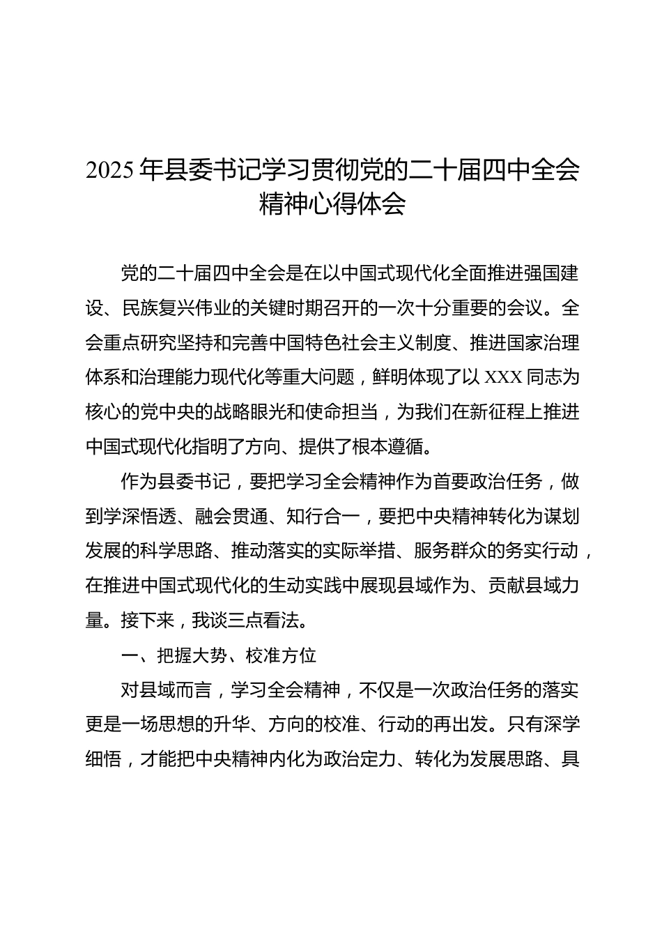 2025年縣委書記學(xué)習(xí)貫徹黨的二十屆四中全會精神心得體會