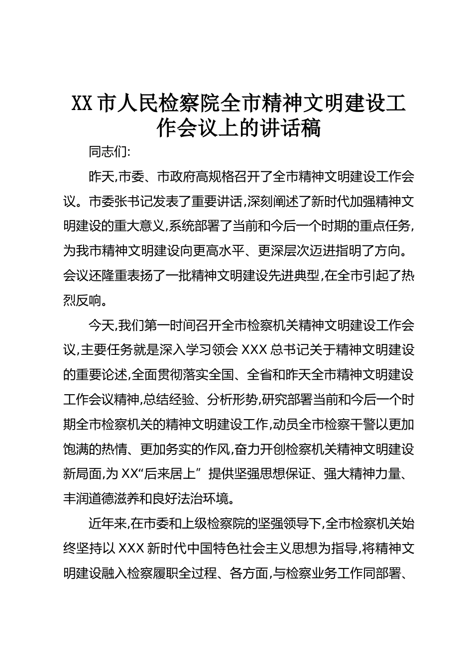 XX市人民檢察院全市精神文明建設(shè)工作會議上的講話稿同志們:昨天,市委、市政府高規(guī)格召開了全市精神文明建設(shè)工作會議。市委張書記發(fā)表了重要講話,深刻闡述了新時代加強(qiáng)精神文明建設(shè)的重大意義,系統(tǒng)部署了當(dāng)前和今后一個時期的重點(diǎn)任務(wù),為我市精神文明建設(shè)向更高水平、更深層次邁進(jìn)指明了方向。會議還隆重表揚(yáng)了一批精神文明建設(shè)先進(jìn)典型,在全市引起了熱烈反響。今天,我們第一時間召開全市檢察機(jī)關(guān)精神文明建設(shè)工作會議,主要任務(wù)就是深入學(xué)習(xí)領(lǐng)會XXX總書記關(guān)于精神文明建設(shè)的重要論述,全面貫徹落實(shí)全國、全省和昨天全市精神文明建設(shè)工作會議精神,總結(jié)經(jīng)驗(yàn)、分析形勢,研究部...