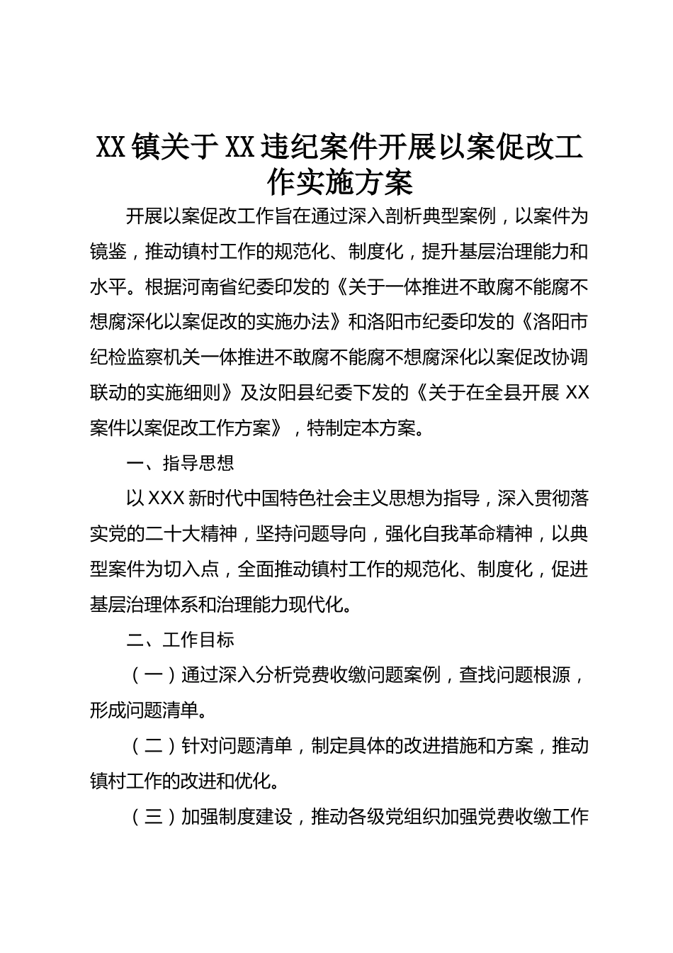XX鎮(zhèn)關(guān)于XX違紀案件開展以案促改工作實施方案