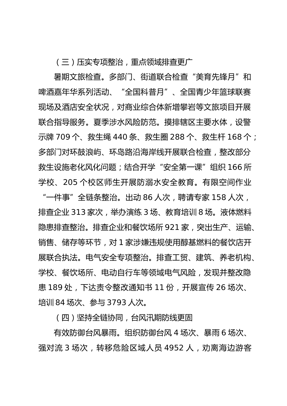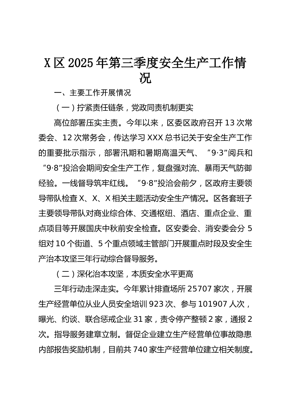 X區(qū)2025年第三季度安全生產(chǎn)工作情況一、主要工作開展情況(一)擰緊責(zé)任鏈條,黨政同責(zé)機制更實高位部署壓實主責(zé)。今年以來,區(qū)委區(qū)政府召開13次常委會、12次常務(wù)會,傳達(dá)學(xué)習(xí)XXX總書記關(guān)于安全生產(chǎn)工作的重要批示指示,部署汛期和暑期高溫天氣、“9·3”閱兵和“9·8”投洽會期間安全生產(chǎn)工作,復(fù)盤強對流、暴雨天氣防御經(jīng)驗。一線督導(dǎo)筑牢紅線?!?·8”投洽會前夕,區(qū)政府主要領(lǐng)導(dǎo)帶隊檢查X、X、X相關(guān)主題活動安全生產(chǎn)情況。區(qū)各套班子主要領(lǐng)導(dǎo)帶隊對商業(yè)綜合體、交通樞紐、酒店、重點企業(yè)、重點項目等開展國慶中秋前安全檢查。區(qū)安委會、消安委會分5組對10個街道、5...