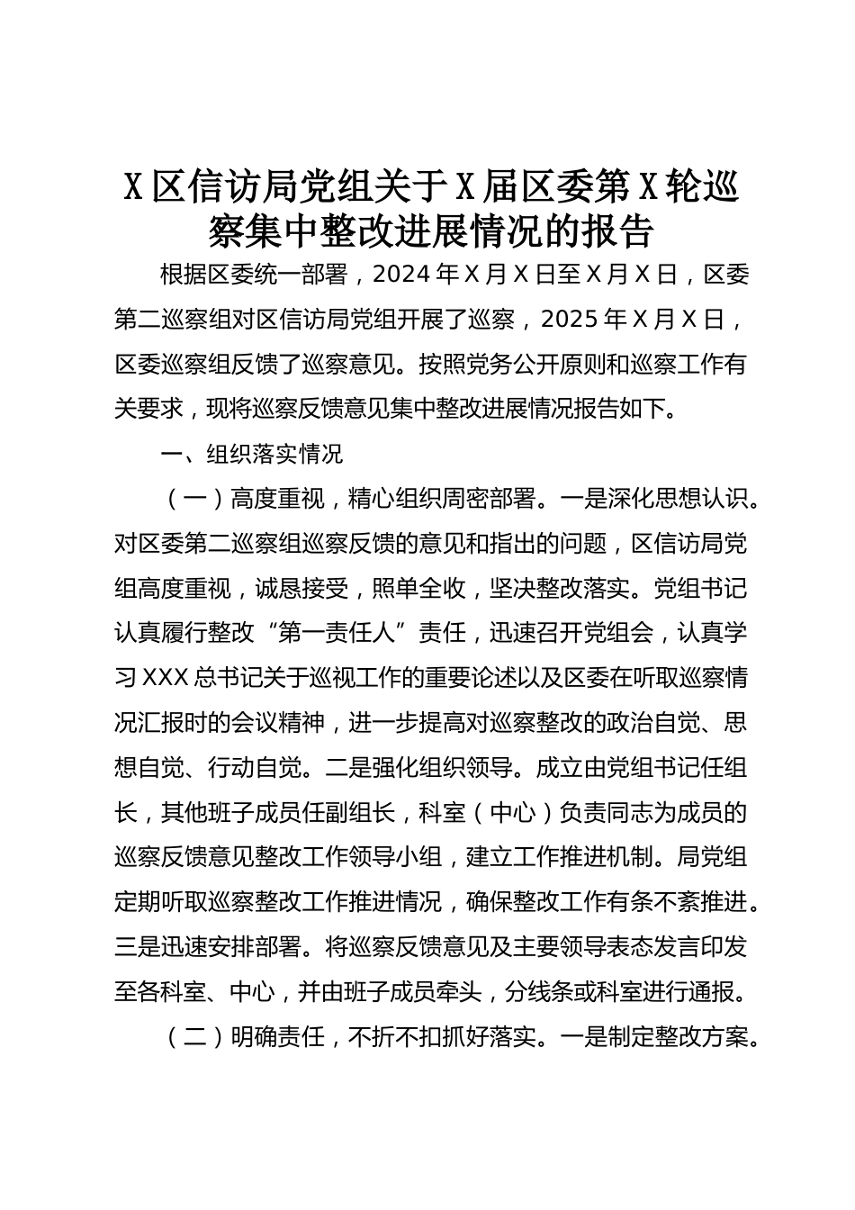 X區(qū)信訪局黨組關(guān)于X屆區(qū)委第X輪巡察集中整改進(jìn)展情況的報(bào)告