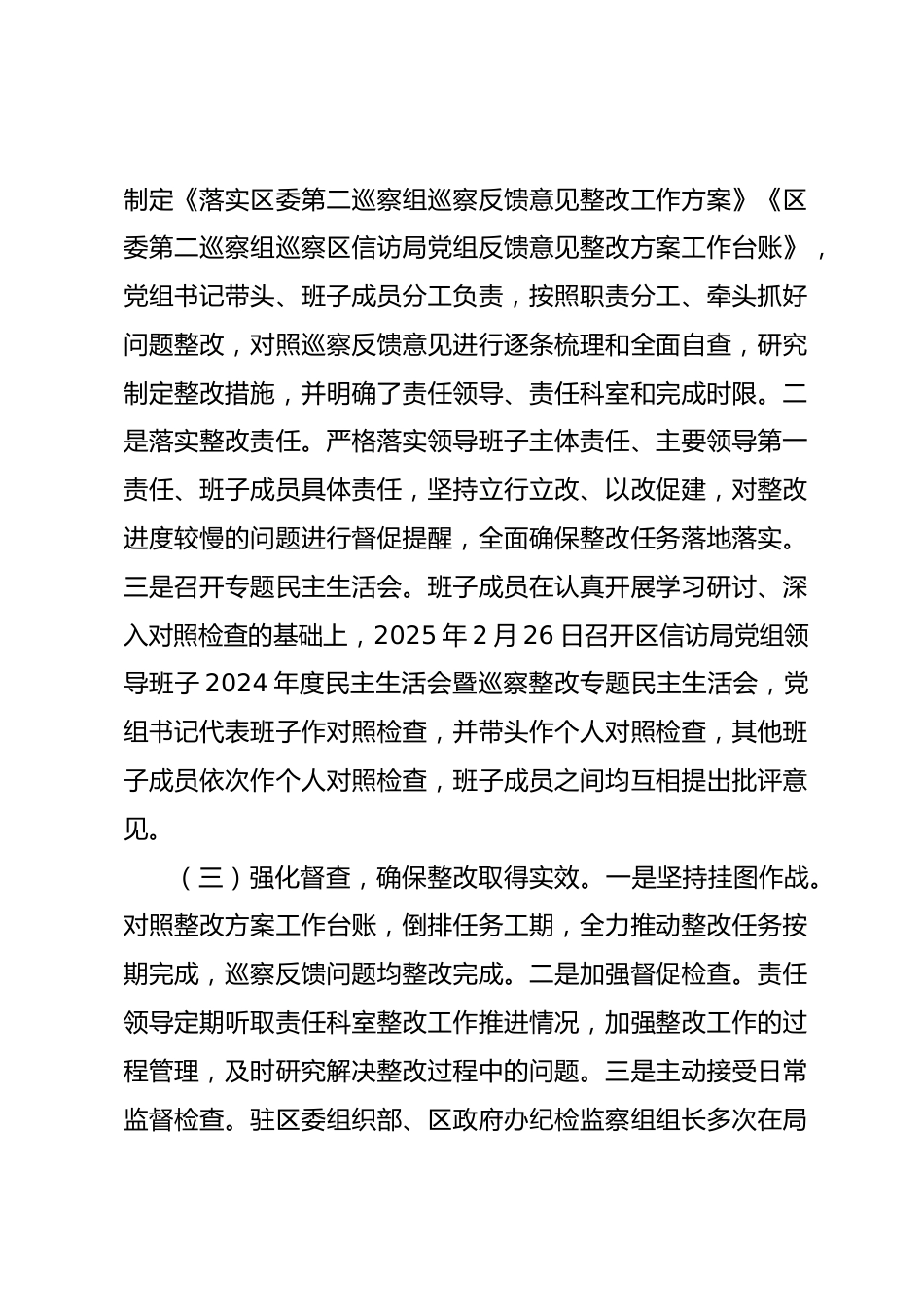 X區(qū)信訪局黨組關(guān)于X屆區(qū)委第X輪巡察集中整改進(jìn)展情況的報(bào)告根據(jù)區(qū)委統(tǒng)一部署,2024年X月X日至X月X日,區(qū)委第二巡察組對(duì)區(qū)信訪局黨組開(kāi)展了巡察,2025年X月X日,區(qū)委巡察組反饋了巡察意見(jiàn)。按照黨務(wù)公開(kāi)原則和巡察工作有關(guān)要求,現(xiàn)將巡察反饋意見(jiàn)集中整改進(jìn)展情況報(bào)告如下。一、組織落實(shí)情況(一)高度重視,精心組織周密部署。一是深化思想認(rèn)識(shí)。對(duì)區(qū)委第二巡察組巡察反饋的意見(jiàn)和指出的問(wèn)題,區(qū)信訪局黨組高度重視,誠(chéng)懇接受,照單全收,堅(jiān)決整改落實(shí)。黨組書(shū)記認(rèn)真履行整改“第一責(zé)任人”責(zé)任,迅速召開(kāi)黨組會(huì),認(rèn)真學(xué)習(xí)XXX總書(shū)記關(guān)于巡視工作的重要論述以及區(qū)委在聽(tīng)取...