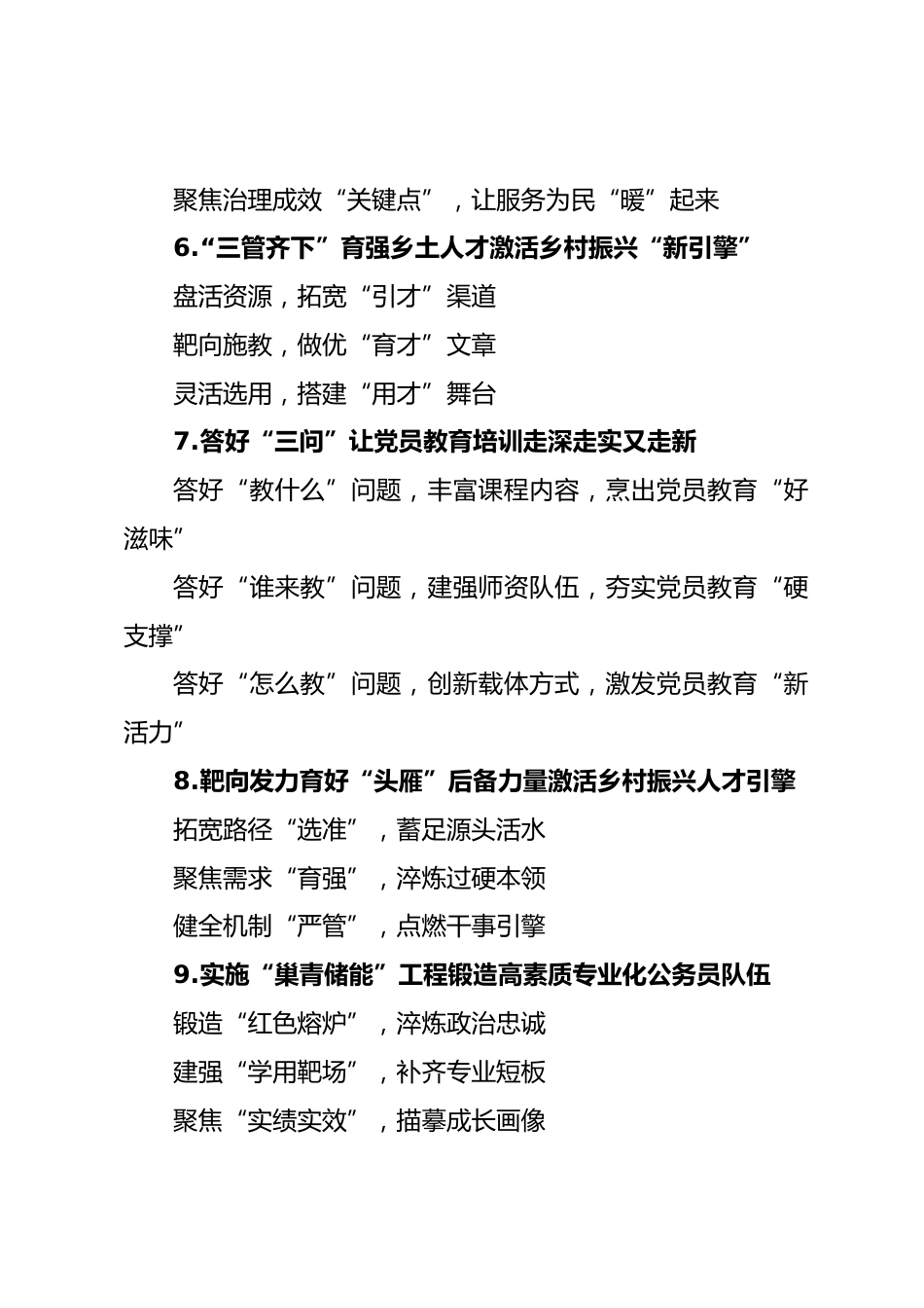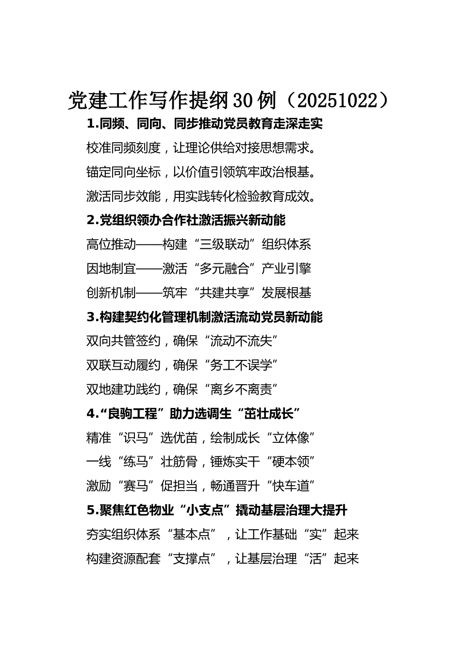 黨建工作寫作提綱30例(20251022)1.同頻、同向、同步推動黨員教育走深走實校準(zhǔn)同頻刻度,讓理論供給對接思想需求。錨定同向坐標(biāo),以價值引領(lǐng)筑牢政治根基。激活同步效能,用實踐轉(zhuǎn)化檢驗教育成效。2.黨組織領(lǐng)辦合作社激活振興新動能高位推動——構(gòu)建“三級聯(lián)動”組織體系因地制宜——激活“多元融合”產(chǎn)業(yè)引擎創(chuàng)新機(jī)制——筑牢“共建共享”發(fā)展根基3.構(gòu)建契約化管理機(jī)制激活流動黨員新動能雙向共管簽約,確保“流動不流失”雙聯(lián)互動履約,確?!皠?wù)工不誤學(xué)”雙地建功踐約,確?!半x鄉(xiāng)不離責(zé)”4.“良駒工程”助力選調(diào)生“茁壯成長”精準(zhǔn)“識馬”選優(yōu)苗,繪制成長“立體像...