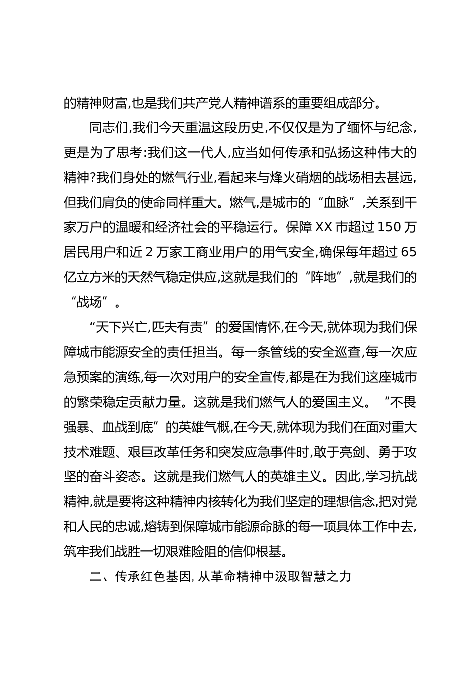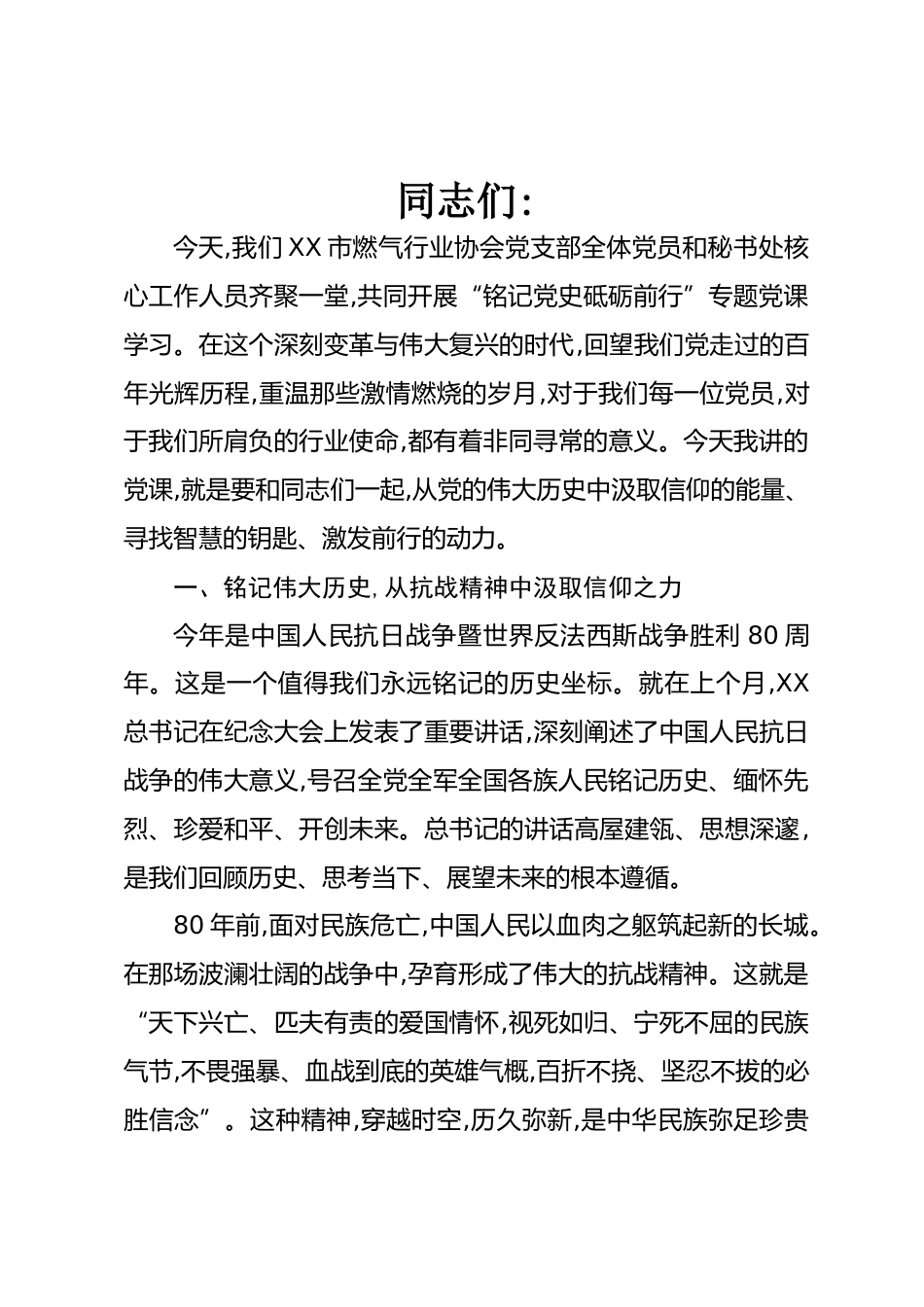 同志們:今天,我們XX市燃?xì)庑袠I(yè)協(xié)會(huì)黨支部全體黨員和秘書處核心工作人員齊聚一堂,共同開展“銘記黨史砥礪前行”專題黨課學(xué)習(xí)。在這個(gè)深刻變革與偉大復(fù)興的時(shí)代,回望我們黨走過(guò)的百年光輝歷程,重溫那些激情燃燒的歲月,對(duì)于我們每一位黨員,對(duì)于我們所肩負(fù)的行業(yè)使命,都有著非同尋常的意義。今天我講的黨課,就是要和同志們一起,從黨的偉大歷史中汲取信仰的能量、尋找智慧的鑰匙、激發(fā)前行的動(dòng)力。一、銘記偉大歷史,從抗戰(zhàn)精神中汲取信仰之力今年是中國(guó)人民抗日戰(zhàn)爭(zhēng)暨世界反法西斯戰(zhàn)爭(zhēng)勝利80周年。這是一個(gè)值得我們永遠(yuǎn)銘記的歷史坐標(biāo)。就在上個(gè)月,XX總書記在紀(jì)念大會(huì)上發(fā)表了...