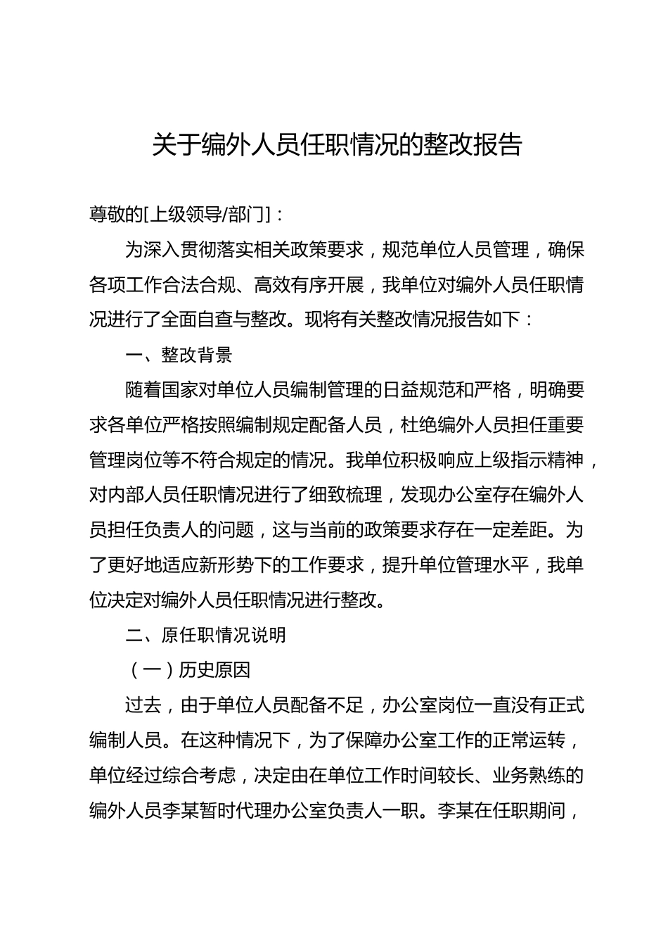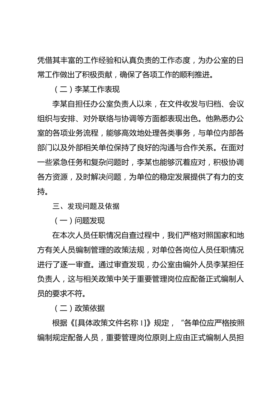關(guān)于編外人員任職情況的整改報告尊敬的[上級領(lǐng)導(dǎo)/部門]:為深入貫徹落實相關(guān)政策要求,規(guī)范單位人員管理,確保各項工作合法合規(guī)、高效有序開展,我單位對編外人員任職情況進行了全面自查與整改?,F(xiàn)將有關(guān)整改情況報告如下:一、整改背景隨著國家對單位人員編制管理的日益規(guī)范和嚴格,明確要求各單位嚴格按照編制規(guī)定配備人員,杜絕編外人員擔任重要管理崗位等不符合規(guī)定的情況。我單位積極響應(yīng)上級指示精神,對內(nèi)部人員任職情況進行了細致梳理,發(fā)現(xiàn)辦公室存在編外人員擔任負責人的問題,這與當前的政策要求存在一定差距。為了更好地適應(yīng)新形勢下的工作要求,提升單位管...