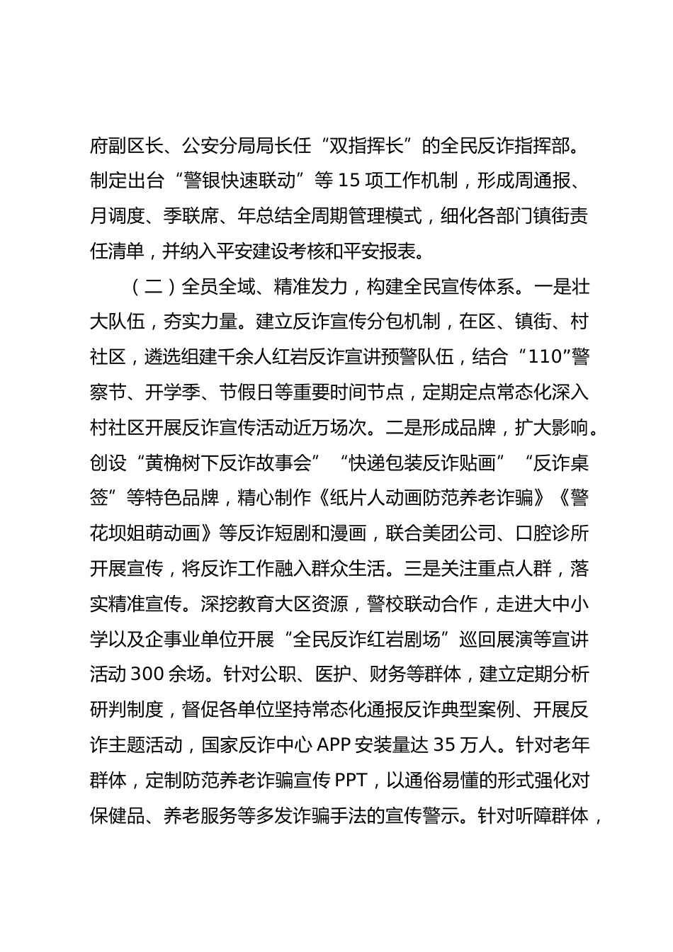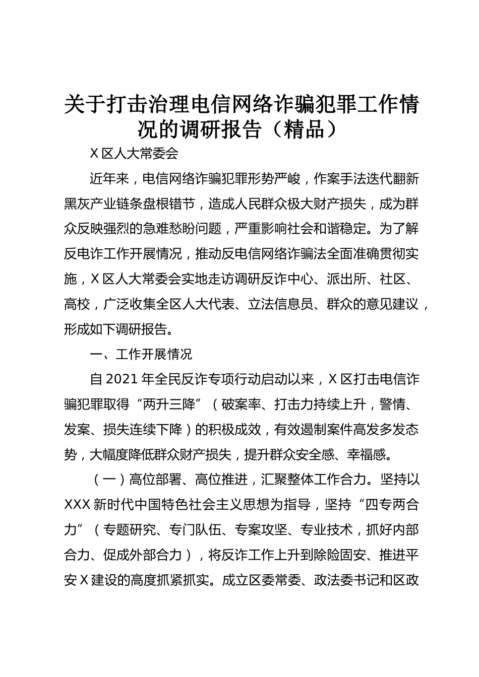 關(guān)于打擊治理電信網(wǎng)絡(luò)詐騙犯罪工作情況的調(diào)研報告(精品)X區(qū)人大常委會近年來,電信網(wǎng)絡(luò)詐騙犯罪形勢嚴峻,作案手法迭代翻新黑灰產(chǎn)業(yè)鏈條盤根錯節(jié),造成人民群眾極大財產(chǎn)損失,成為群眾反映強烈的急難愁盼問題,嚴重影響社會和諧穩(wěn)定。為了解反電詐工作開展情況,推動反電信網(wǎng)絡(luò)詐騙法全面準確貫徹實施,X區(qū)人大常委會實地走訪調(diào)研反詐中心、派出所、社區(qū)、高校,廣泛收集全區(qū)人大代表、立法信息員、群眾的意見建議,形成如下調(diào)研報告。一、工作開展情況自2021年全民反詐專項行動啟動以來,X區(qū)打擊電信詐騙犯罪取得“兩升三降”(破案率、打擊力持續(xù)上升,警情、發(fā)案、...