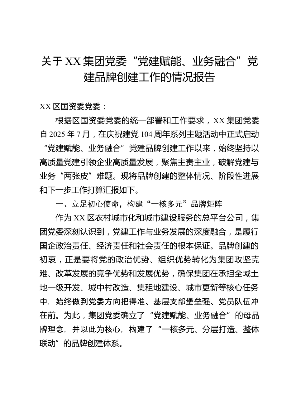 關于XX集團黨委“黨建賦能、業(yè)務融合”黨建品牌創(chuàng)建工作的情況報告XX區(qū)國資委黨委:根據(jù)區(qū)國資委黨委的統(tǒng)一部署和工作要求,XX集團黨委自2025年7月,在慶祝建黨104周年系列主題活動中正式啟動“黨建賦能、業(yè)務融合”黨建品牌創(chuàng)建工作以來,始終堅持以高質量黨建引領企業(yè)高質量發(fā)展,聚焦主責主業(yè),破解黨建與業(yè)務“兩張皮”難題?,F(xiàn)將品牌創(chuàng)建的整體情況、階段性進展和下一步工作打算匯報如下。一、立足初心使命,構建“一核多元”品牌矩陣作為XX區(qū)農村城市化和城市建設服務的總平臺公司,集團黨委深刻認識到,黨建工作與業(yè)務發(fā)展的深度融合,是履行國企政治責任、經濟責...