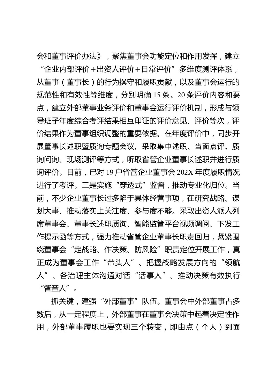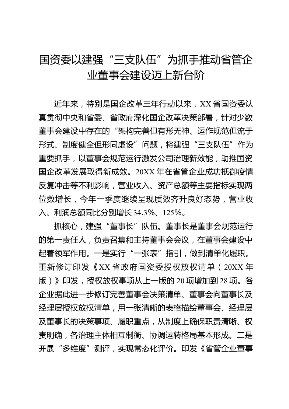 國資委以建強(qiáng)“三支隊伍”為抓手推動省管企業(yè)董事會建設(shè)邁上新臺階近年來,特別是國企改革三年行動以來,XX省國資委認(rèn)真貫徹中央和省委、省政府深化國企改革決策部署,針對少數(shù)董事會建設(shè)中存在的“架構(gòu)完善但有形無神、運(yùn)作規(guī)范但流于形式、制度健全但形同虛設(shè)”問題,將建強(qiáng)“三支隊伍”作為重要抓手,以董事會規(guī)范運(yùn)行激發(fā)公司治理新效能,助推國資國企改革發(fā)展取得新成效。20XX年在省管企業(yè)成功抵御疫情反復(fù)沖擊等不利影響,營業(yè)收入、資產(chǎn)總額等主要指標(biāo)實(shí)現(xiàn)兩位數(shù)增長,今年一季度繼續(xù)呈現(xiàn)質(zhì)效齊升良好態(tài)勢,營業(yè)收入、利潤總額同比分別增長34.3%、125%。抓核心,...