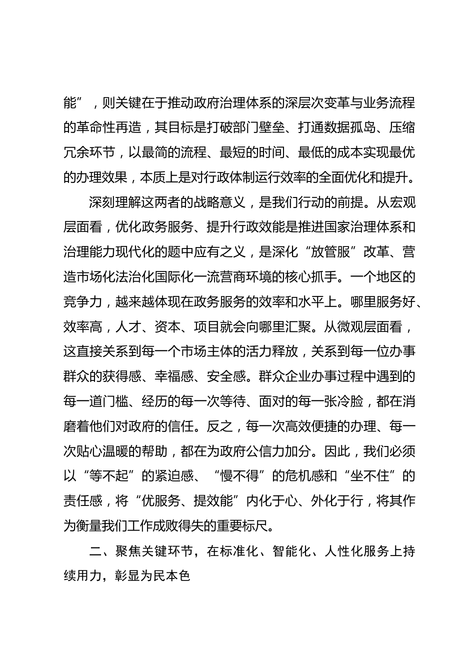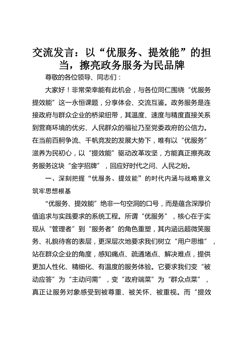 交流發(fā)言:以“優(yōu)服務(wù)、提效能”的擔(dān)當(dāng),擦亮政務(wù)服務(wù)為民品牌尊敬的各位領(lǐng)導(dǎo)、同志們:大家好!非常榮幸能有此機(jī)會(huì),與各位同仁圍繞“優(yōu)服務(wù)提效能”這一永恒課題,分享體會(huì)、交流互鑒。政務(wù)服務(wù)是連接政府與群眾企業(yè)的橋梁紐帶,其溫度、速度與精度直接關(guān)系到營(yíng)商環(huán)境的優(yōu)劣、人民群眾的福祉乃至黨委政府的公信力。在當(dāng)前百舸爭(zhēng)流、千帆競(jìng)發(fā)的發(fā)展大勢(shì)下,唯有以“優(yōu)服務(wù)”滋養(yǎng)為民初心,以“提效能”驅(qū)動(dòng)改革攻堅(jiān),方能真正擦亮政務(wù)服務(wù)這塊“金字招牌”,回應(yīng)好時(shí)代之問(wèn)、人民之盼。一、深刻把握“優(yōu)服務(wù)、提效能”的時(shí)代內(nèi)涵與戰(zhàn)略意義筑牢思想根基“優(yōu)服務(wù)、提效能...