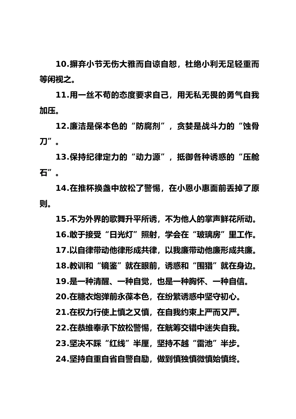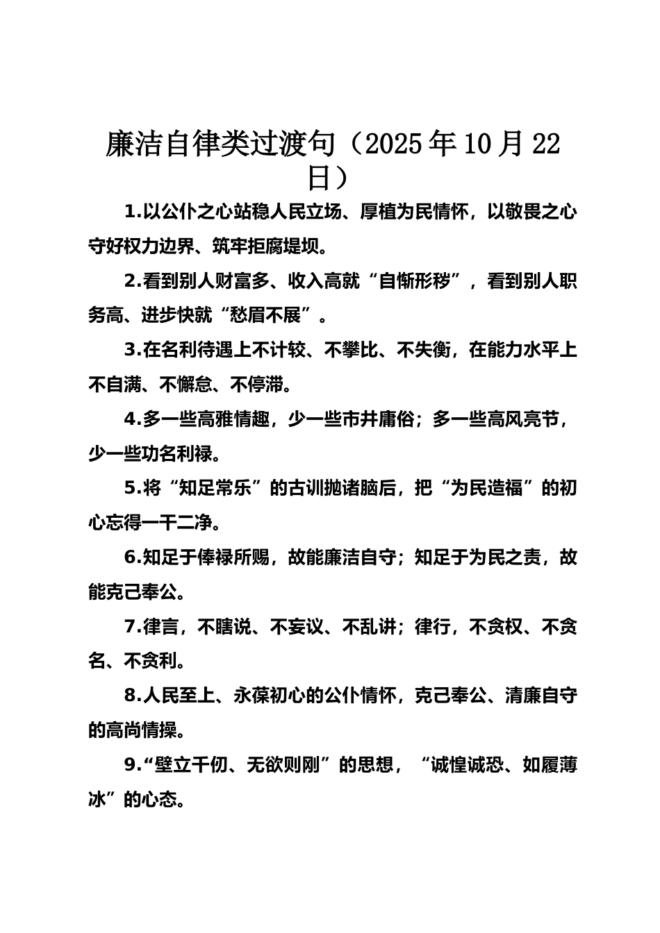 廉潔自律類過渡句(2025年10月22日)1.以公仆之心站穩(wěn)人民立場、厚植為民情懷,以敬畏之心守好權(quán)力邊界、筑牢拒腐堤壩。2.看到別人財(cái)富多、收入高就“自慚形穢”,看到別人職務(wù)高、進(jìn)步快就“愁眉不展”。3.在名利待遇上不計(jì)較、不攀比、不失衡,在能力水平上不自滿、不懈怠、不停滯。4.多一些高雅情趣,少一些市井庸俗;多一些高風(fēng)亮節(jié),少一些功名利祿。5.將“知足常樂”的古訓(xùn)拋諸腦后,把“為民造?!钡某跣耐靡桓啥?。6.知足于俸祿所賜,故能廉潔自守;知足于為民之責(zé),故能克己奉公。7.律言,不瞎說、不妄議、不亂講;律行,不貪權(quán)、不貪名、不貪利。8.人民至上...