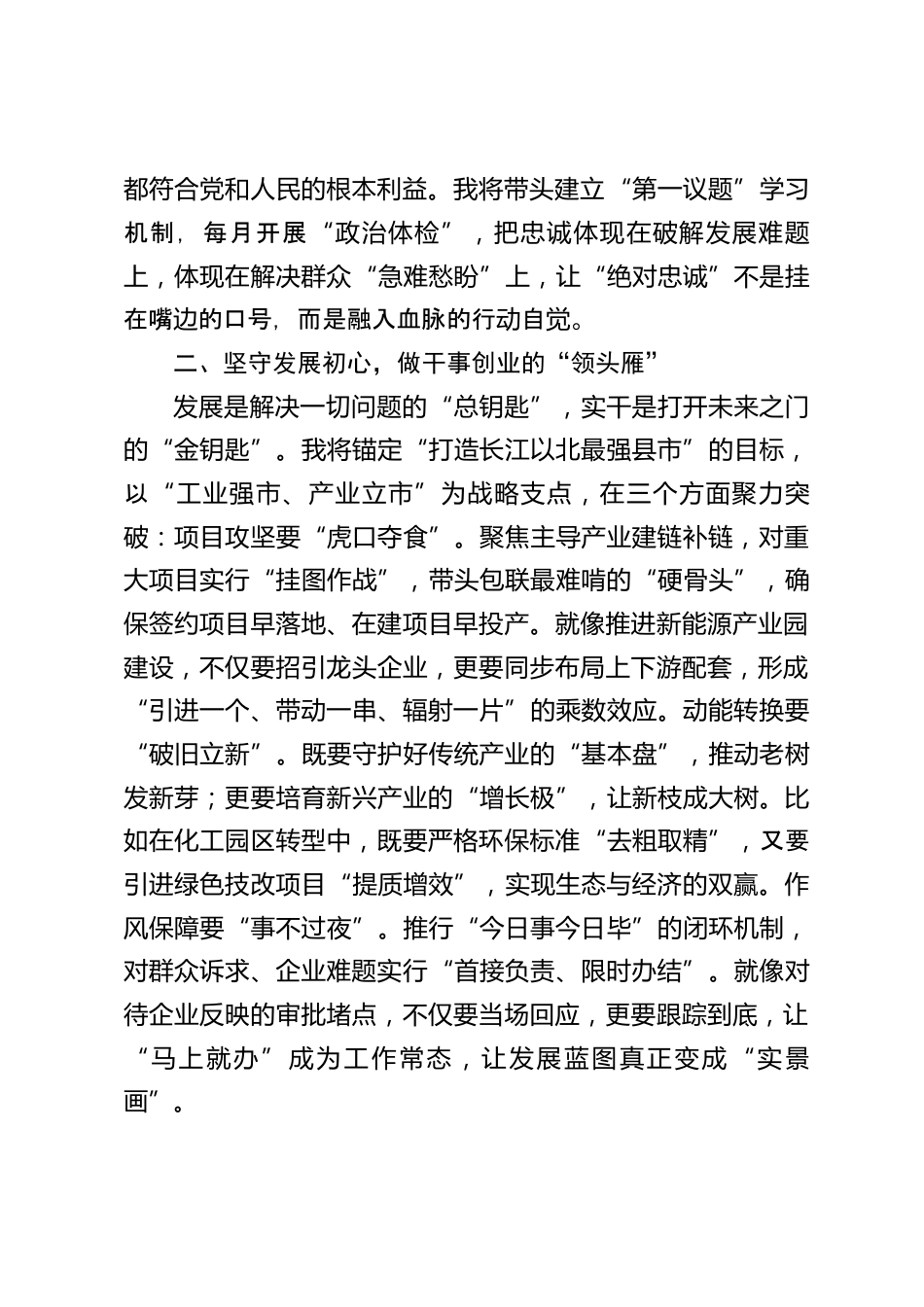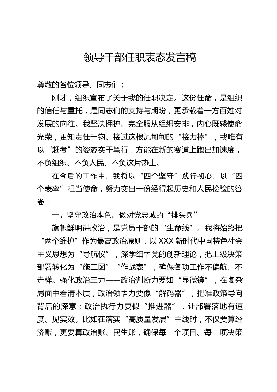 領(lǐng)導(dǎo)干部任職表態(tài)發(fā)言稿尊敬的各位領(lǐng)導(dǎo)、同志們:剛才,組織宣布了關(guān)于我的任職決定。這份任命,是組織的信任與重托,是同志們的支持與期盼,更承載著一方百姓對(duì)發(fā)展的向往。我堅(jiān)決擁護(hù)、完全服從組織安排,內(nèi)心既感使命光榮,更知責(zé)任千鈞。接過這根沉甸甸的“接力棒”,我唯有以“趕考”的姿態(tài)實(shí)干篤行,方能在新的賽道上跑出加速度,不負(fù)組織、不負(fù)人民、不負(fù)這片熱土。在今后的工作中,我將以“四個(gè)堅(jiān)守”踐行初心,以“四個(gè)表率”擔(dān)當(dāng)使命,努力交出一份經(jīng)得起歷史和人民檢驗(yàn)的答卷:一、堅(jiān)守政治本色,做對(duì)黨忠誠(chéng)的“排頭兵”旗幟鮮明講政治,是黨員干部的“生命線...