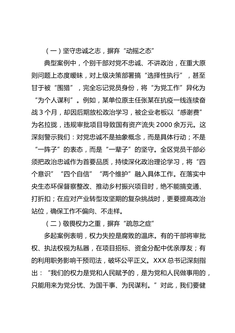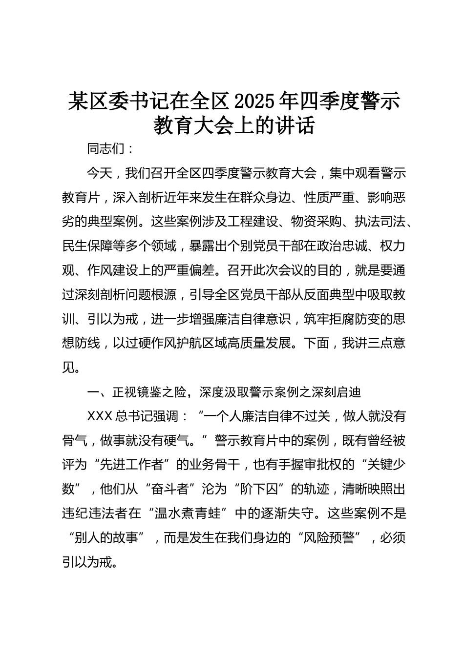 某區(qū)委書記在全區(qū)2025年四季度警示教育大會上的講話同志們:今天,我們召開全區(qū)四季度警示教育大會,集中觀看警示教育片,深入剖析近年來發(fā)生在群眾身邊、性質(zhì)嚴(yán)重、影響惡劣的典型案例。這些案例涉及工程建設(shè)、物資采購、執(zhí)法司法、民生保障等多個領(lǐng)域,暴露出個別黨員干部在政治忠誠、權(quán)力觀、作風(fēng)建設(shè)上的嚴(yán)重偏差。召開此次會議的目的,就是要通過深刻剖析問題根源,引導(dǎo)全區(qū)黨員干部從反面典型中吸取教訓(xùn)、引以為戒,進(jìn)一步增強(qiáng)廉潔自律意識,筑牢拒腐防變的思想防線,以過硬作風(fēng)護(hù)航區(qū)域高質(zhì)量發(fā)展。下面,我講三點(diǎn)意見。一、正視鏡鑒之險,深度汲取警示案例之深刻...