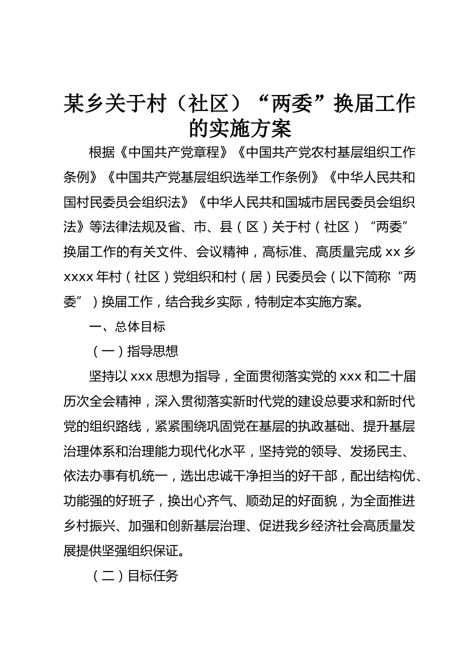某鄉(xiāng)關(guān)于村(社區(qū))“兩委”換屆工作的實施方案根據(jù)《中國共產(chǎn)黨章程》《中國共產(chǎn)黨農(nóng)村基層組織工作條例》《中國共產(chǎn)黨基層組織選舉工作條例》《中華人民共和國村民委員會組織法》《中華人民共和國城市居民委員會組織法》等法律法規(guī)及省、市、縣(區(qū))關(guān)于村(社區(qū))“兩委”換屆工作的有關(guān)文件、會議精神,高標準、高質(zhì)量完成xx鄉(xiāng)xxxx年村(社區(qū))黨組織和村(居)民委員會(以下簡稱“兩委”)換屆工作,結(jié)合我鄉(xiāng)實際,特制定本實施方案。一、總體目標(一)指導思想堅持以xxx思想為指導,全面貫徹落實黨的xxx和二十屆歷次全會精神,深入貫徹落實新時代黨的建設(shè)總要求...