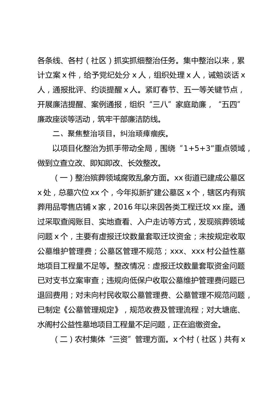 某鄉(xiāng)鎮(zhèn)關于群眾身邊不正之風和腐敗問題集中整治工作情況匯報自群眾身邊不正之風和腐敗問題集中整治開展以來,xx街道黨工委堅決扛起政治責任,堅持以人民為中心,注重整體推進和重點突破相結合,以強烈的責任感、緊迫感推動集中整治工作走深走實?,F(xiàn)將有關情況報告如下:一、提高政治站位,壓緊壓實各方責任。一是黨工委扛牢主體責任。把集中整治工作作為重大政治任務緊緊抓在手上,通過召開全面從嚴治黨專題會,集中整治工作推進會等,傳達學習上級相關會議精神和文件要求,研究部署集中整治工作。黨工委書記嚴格落實第一責任人職責,經常主動過問、聽取民政、鄉(xiāng)村振興等...