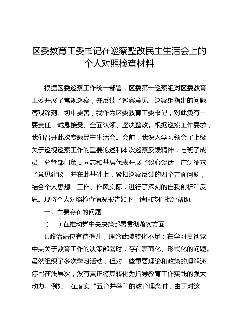區(qū)委教育工委書(shū)記在巡察整改民主生活會(huì)上的個(gè)人對(duì)照檢查材料