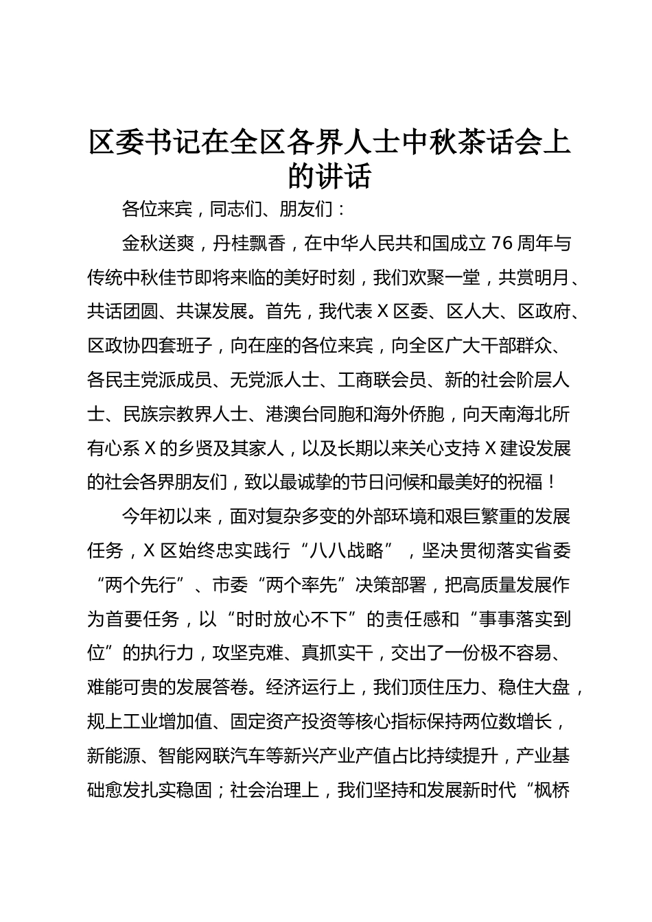 區(qū)委書記在全區(qū)各界人士中秋茶話會上的講話
