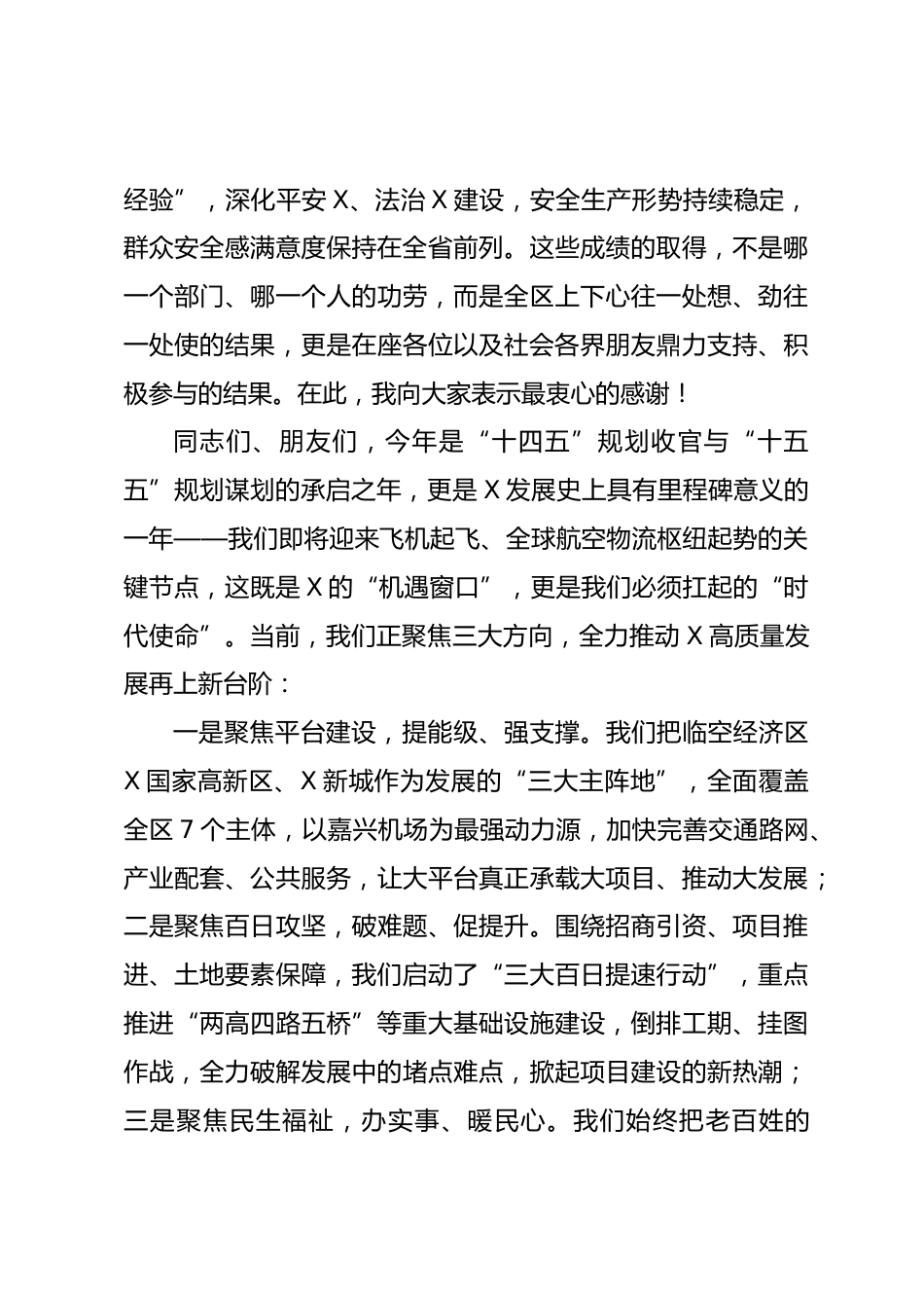 區(qū)委書記在全區(qū)各界人士中秋茶話會上的講話各位來賓,同志們、朋友們:金秋送爽,丹桂飄香,在中華人民共和國成立76周年與傳統(tǒng)中秋佳節(jié)即將來臨的美好時刻,我們歡聚一堂,共賞明月、共話團圓、共謀發(fā)展。首先,我代表X區(qū)委、區(qū)人大、區(qū)政府、區(qū)政協(xié)四套班子,向在座的各位來賓,向全區(qū)廣大干部群眾、各民主黨派成員、無黨派人士、工商聯(lián)會員、新的社會階層人士、民族宗教界人士、港澳臺同胞和海外僑胞,向天南海北所有心系X的鄉(xiāng)賢及其家人,以及長期以來關心支持X建設發(fā)展的社會各界朋友們,致以最誠摯的節(jié)日問候和最美好的祝福!今年初以來,面對復雜多變的外部環(huán)境和...