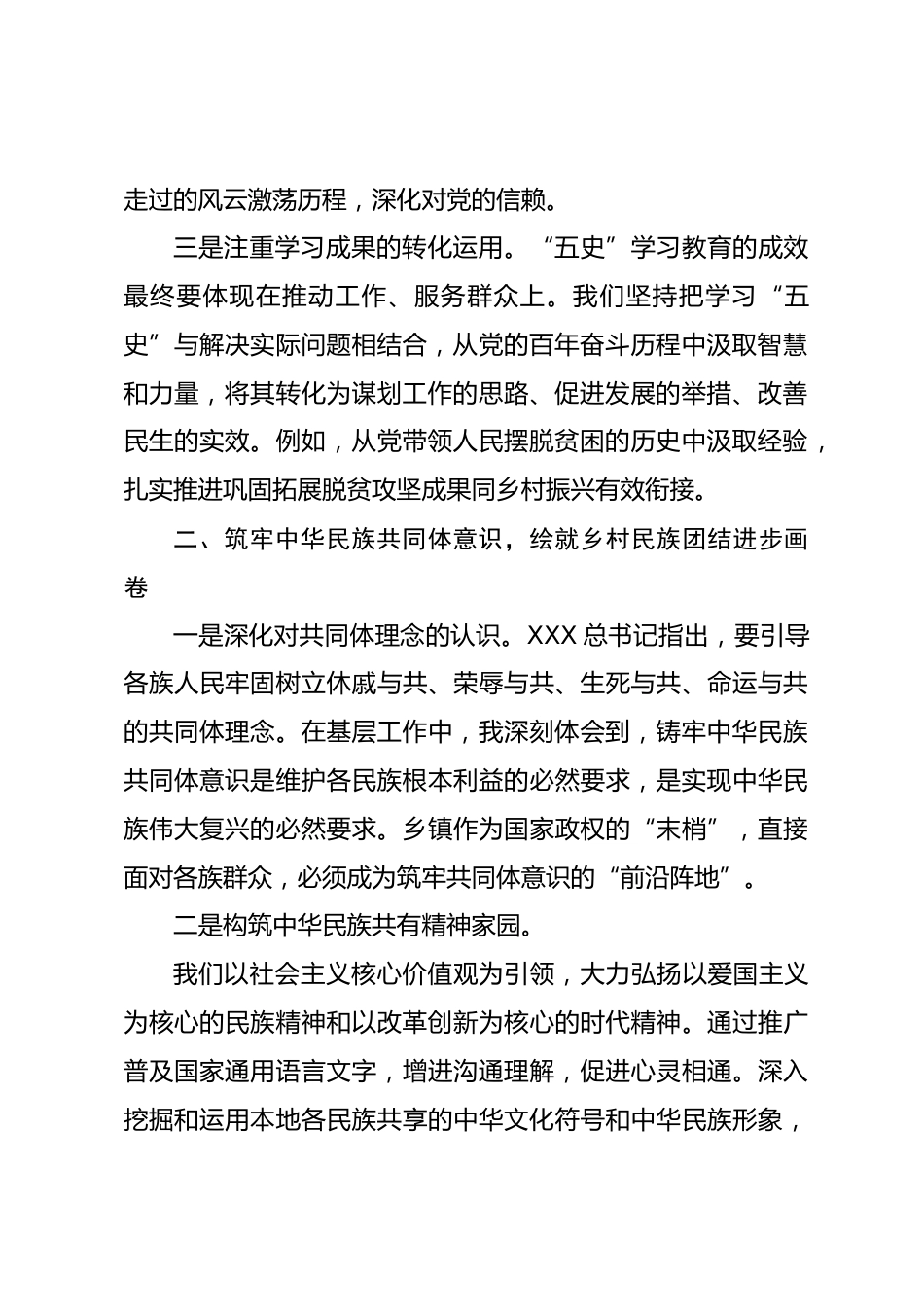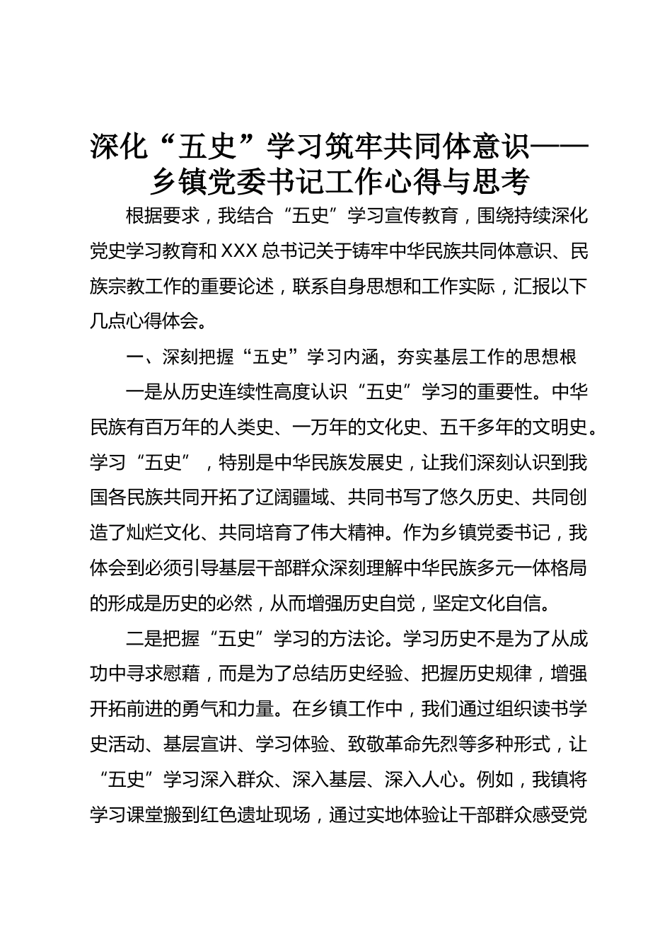 深化“五史”學(xué)習(xí)筑牢共同體意識(shí)——鄉(xiāng)鎮(zhèn)黨委書記工作心得與思考根據(jù)要求,我結(jié)合“五史”學(xué)習(xí)宣傳教育,圍繞持續(xù)深化黨史學(xué)習(xí)教育和XXX總書記關(guān)于鑄牢中華民族共同體意識(shí)、民族宗教工作的重要論述,聯(lián)系自身思想和工作實(shí)際,匯報(bào)以下幾點(diǎn)心得體會(huì)。一、深刻把握“五史”學(xué)習(xí)內(nèi)涵,夯實(shí)基層工作的思想根一是從歷史連續(xù)性高度認(rèn)識(shí)“五史”學(xué)習(xí)的重要性。中華民族有百萬(wàn)年的人類史、一萬(wàn)年的文化史、五千多年的文明史。學(xué)習(xí)“五史”,特別是中華民族發(fā)展史,讓我們深刻認(rèn)識(shí)到我國(guó)各民族共同開拓了遼闊疆域、共同書寫了悠久歷史、共同創(chuàng)造了燦爛文化、共同培育了偉大精神。...