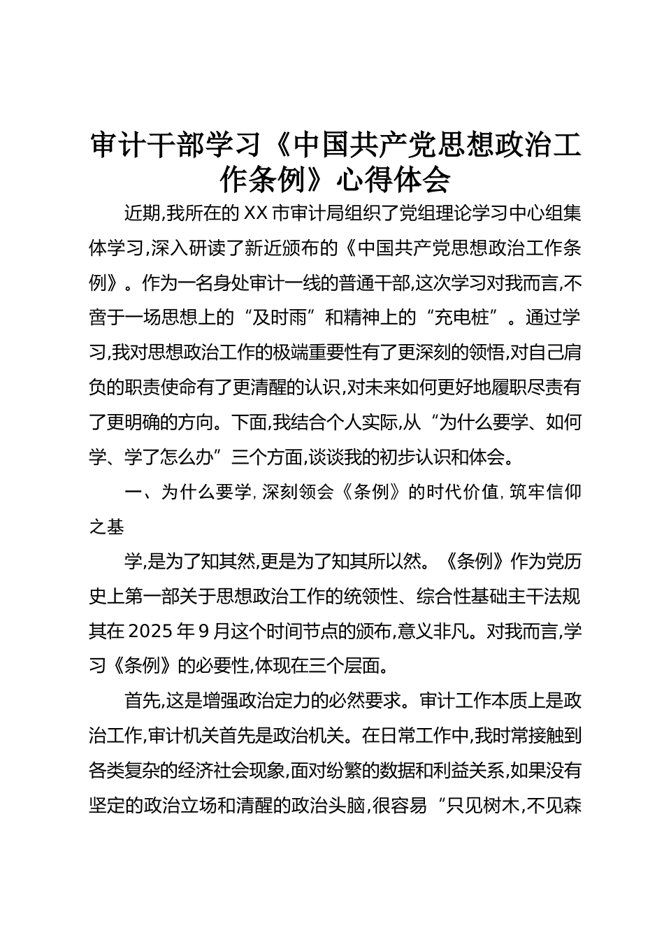 審計(jì)干部學(xué)習(xí)《中國(guó)共產(chǎn)黨思想政治工作條例》心得體會(huì)近期,我所在的XX市審計(jì)局組織了黨組理論學(xué)習(xí)中心組集體學(xué)習(xí),深入研讀了新近頒布的《中國(guó)共產(chǎn)黨思想政治工作條例》。作為一名身處審計(jì)一線的普通干部,這次學(xué)習(xí)對(duì)我而言,不啻于一場(chǎng)思想上的“及時(shí)雨”和精神上的“充電樁”。通過(guò)學(xué)習(xí),我對(duì)思想政治工作的極端重要性有了更深刻的領(lǐng)悟,對(duì)自己肩負(fù)的職責(zé)使命有了更清醒的認(rèn)識(shí),對(duì)未來(lái)如何更好地履職盡責(zé)有了更明確的方向。下面,我結(jié)合個(gè)人實(shí)際,從“為什么要學(xué)、如何學(xué)、學(xué)了怎么辦”三個(gè)方面,談?wù)勎业某醪秸J(rèn)識(shí)和體會(huì)。一、為什么要學(xué),深刻領(lǐng)會(huì)《條例》的時(shí)代價(jià)值,筑牢信仰之...