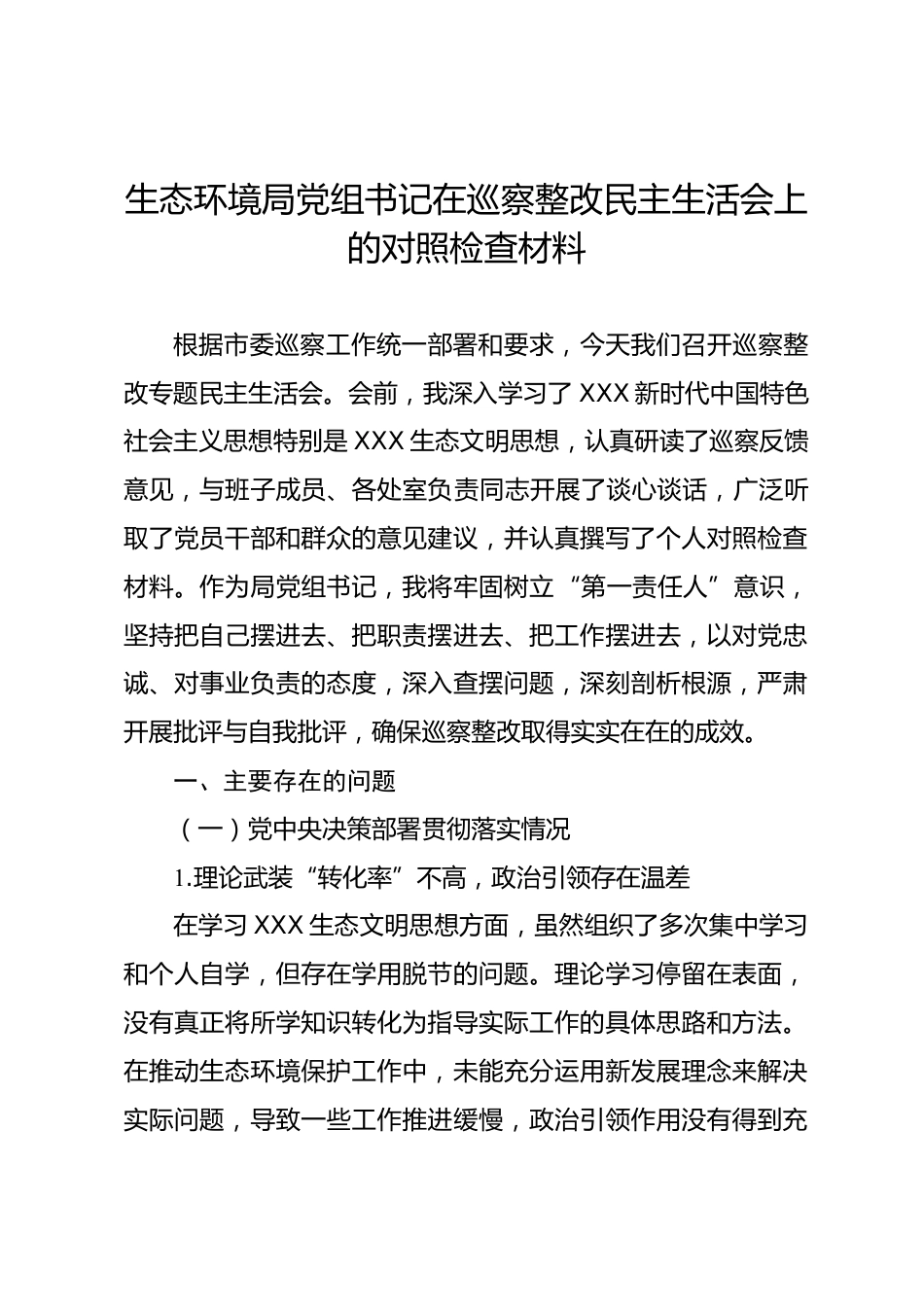 生態(tài)環(huán)境局黨組書記在巡察整改民主生活會上的對照檢查材料根據(jù)市委巡察工作統(tǒng)一部署和要求,今天我們召開巡察整改專題民主生活會。會前,我深入學(xué)習(xí)了XXX新時代中國特色社會主義思想特別是XXX生態(tài)文明思想,認(rèn)真研讀了巡察反饋意見,與班子成員、各處室負(fù)責(zé)同志開展了談心談話,廣泛聽取了黨員干部和群眾的意見建議,并認(rèn)真撰寫了個人對照檢查材料。作為局黨組書記,我將牢固樹立“第一責(zé)任人”意識,堅持把自己擺進(jìn)去、把職責(zé)擺進(jìn)去、把工作擺進(jìn)去,以對黨忠誠、對事業(yè)負(fù)責(zé)的態(tài)度,深入查擺問題,深刻剖析根源,嚴(yán)肅開展批評與自我批評,確保巡察整改取得實實在在的成效...