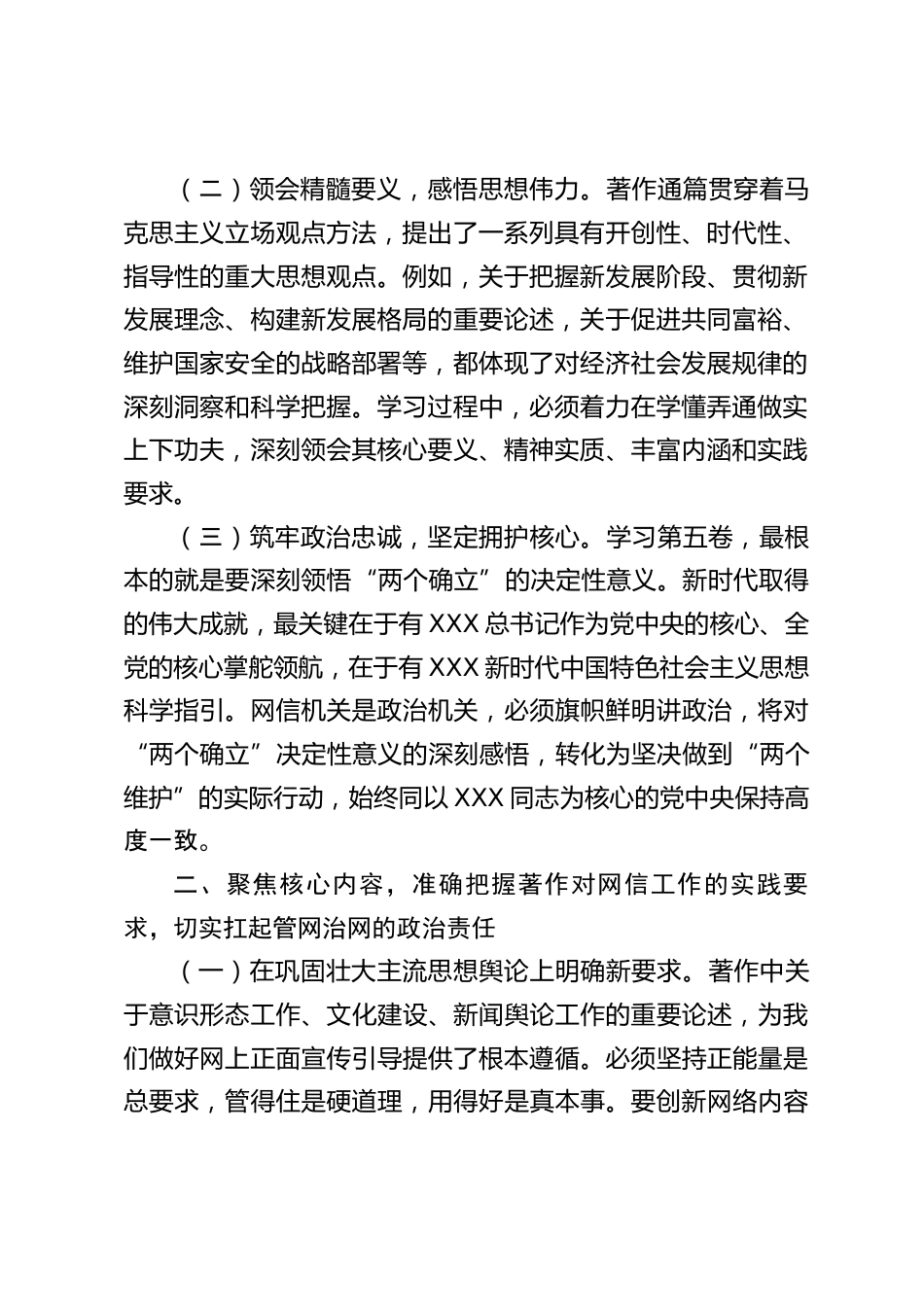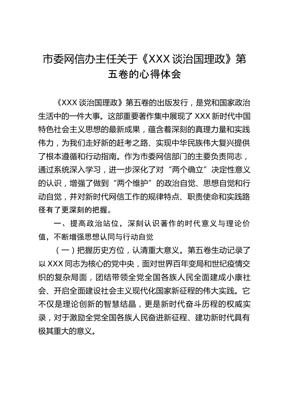 市委網(wǎng)信辦主任關于《XXX談治國理政》第五卷的心得體會《XXX談治國理政》第五卷的出版發(fā)行,是黨和國家政治生活中的一件大事。這部重要著作集中展現(xiàn)了XXX新時代中國特色社會主義思想的最新成果,蘊含著深刻的真理力量和實踐偉力,為我們走好新的趕考之路、實現(xiàn)中華民族偉大復興提供了根本遵循和行動指南。作為市委網(wǎng)信部門的主要負責同志,通過系統(tǒng)深入學習,進一步深化了對“兩個確立”決定性意義的認識,增強了做到“兩個維護”的政治自覺、思想自覺和行動自覺,并對新時代網(wǎng)信工作的規(guī)律特點、職責使命和實踐路徑有了更深刻的把握。一、提高政治站位,深刻認識著作的...