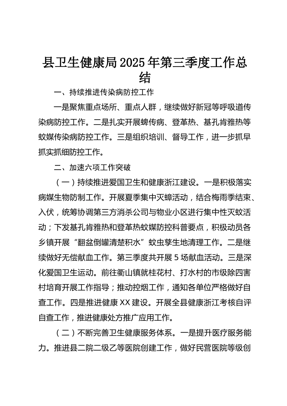 縣衛(wèi)生健康局2025年第三季度工作總結(jié)