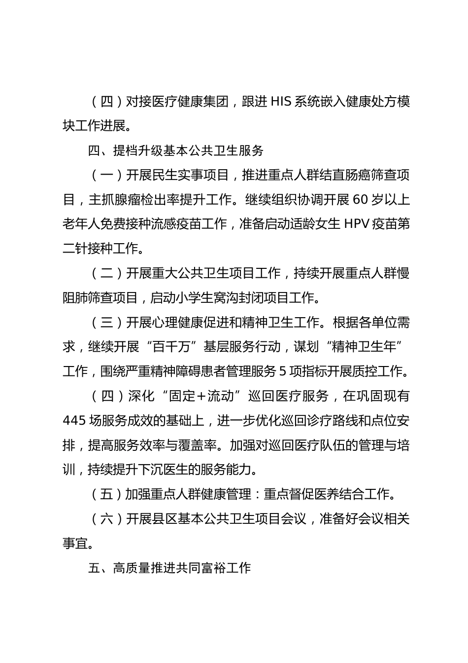 縣衛(wèi)生健康局2025年第四季度工作計劃一、傳染病防控工作常態(tài)化扎實開展蜱傳病等重點傳染病防控工作,持續(xù)開展“發(fā)熱伴”、登革熱、基孔肯雅熱等蟲媒傳染病防控工作,做好應(yīng)急處置工作。二、優(yōu)化提升醫(yī)療衛(wèi)生服務(wù)水平(一)繼續(xù)做好縣級公立醫(yī)院醫(yī)改控費關(guān)鍵指標的審核。(二)進一步完善懸水小島(衢山、長涂)醫(yī)療服務(wù)能力提升方案。(三)做好急救轉(zhuǎn)運不規(guī)范、重復(fù)醫(yī)療檢驗檢查、殯葬領(lǐng)域、醫(yī)?;鸺姓蔚然仡^看工作。(四)做好領(lǐng)導(dǎo)干部健康體檢項目調(diào)整工作。三、推進愛國衛(wèi)生和健康浙江建設(shè)(一)密切關(guān)注省控煙暗訪組的動態(tài),持續(xù)做好全縣重點公共場所控煙,對...