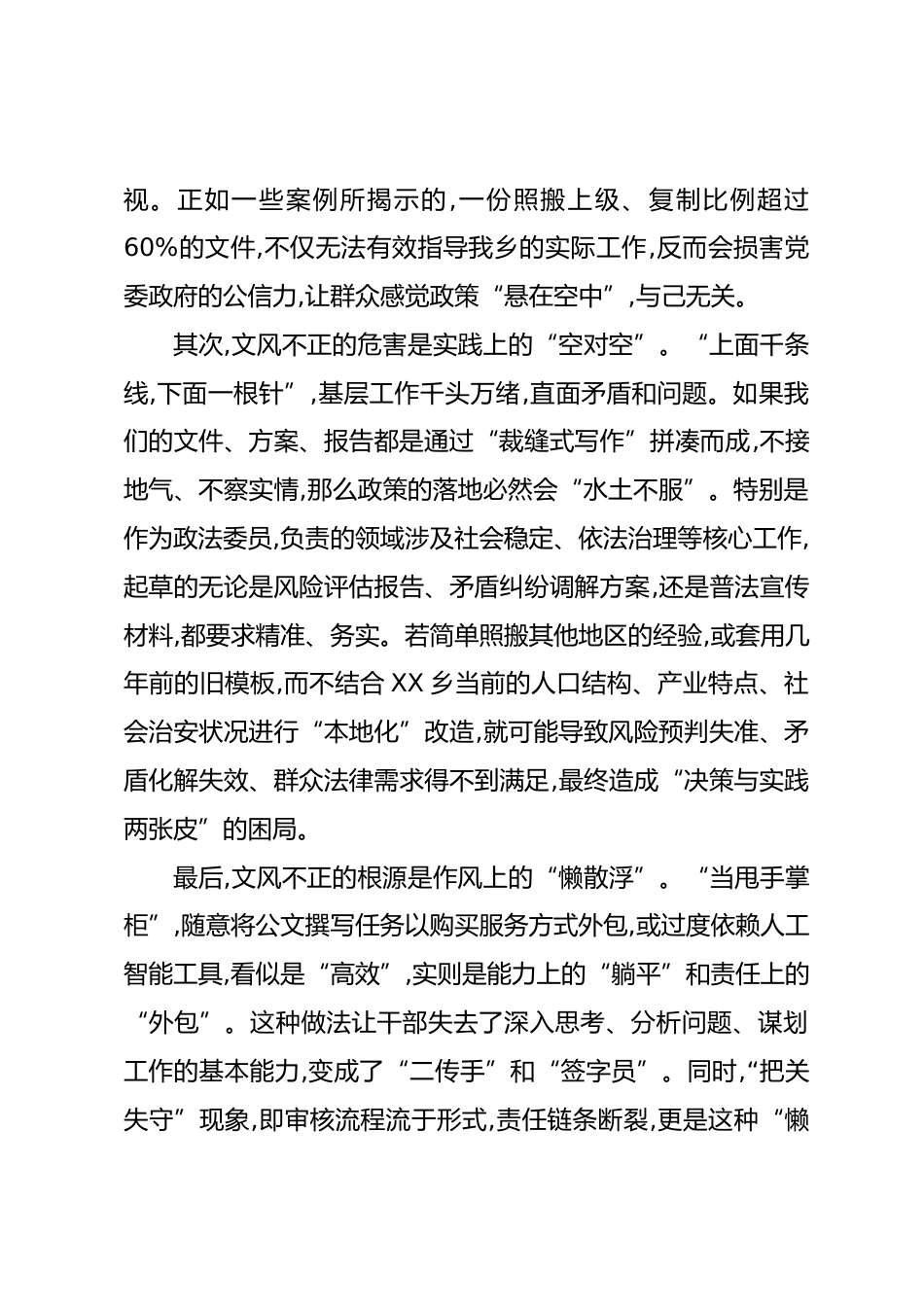 鄉(xiāng)黨委副書記研討發(fā)言材料:深化思想認(rèn)識,勇于自我革命,堅(jiān)決糾治文風(fēng)作風(fēng)頑疾(精品)根據(jù)上級關(guān)于圍繞改進(jìn)文風(fēng)、轉(zhuǎn)變作風(fēng)開展專題研討的部署要求,我結(jié)合自身作為XX縣XX鄉(xiāng)黨委副書記、政法委員的崗位職責(zé)和思想工作實(shí)際,聚焦“抄襲雷同、敷衍應(yīng)付、照抄照搬、當(dāng)甩手掌柜、把關(guān)失守”等五個方面的問題,進(jìn)行了深入的思考和檢視。下面,我從個人角度,談三點(diǎn)認(rèn)識、差距和要求,向組織作一次思想?yún)R報(bào)。一、提高站位,深刻認(rèn)識文風(fēng)不正的極端危害性文風(fēng)是思想作風(fēng)、工作作風(fēng)的集中體現(xiàn),是觀察一名干部政治能力、宗旨意識和責(zé)任擔(dān)當(dāng)?shù)闹匾翱?。一段時(shí)間以來,一些不良文風(fēng)現(xiàn)象禁而...