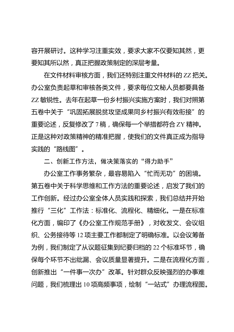 第五卷出版以來,我作為鄉(xiāng)鎮(zhèn)辦公室主任,我始終將其作為案頭卷、工具書,堅持在學(xué)中干、在干中學(xué),堅持把學(xué)習(xí)這部著作作為提升ZZ能力、履職能力的重要途徑。作為鄉(xiāng)鎮(zhèn)辦公室主任,我深切體會到,這本書不僅講的是國家治理的大道理,更對我們基層如何具體開展工作有著直接的指導(dǎo)意義。辦公室工作千頭萬緒,既要服務(wù)領(lǐng)導(dǎo)決策,又要協(xié)調(diào)各方落實,還要保障日常運轉(zhuǎn),如何在新形勢下做好這些工作,第五卷給了我們指明了方向、提供了方法。下面,結(jié)合自身工作,從以下五個維度分享幾點看法和體會:一、把準(zhǔn)ZZ方向,做D委ZF的“可靠前哨”辦公室工作ZZ性是第一位的。第五卷中關(guān)...