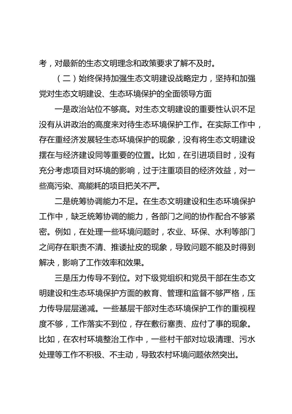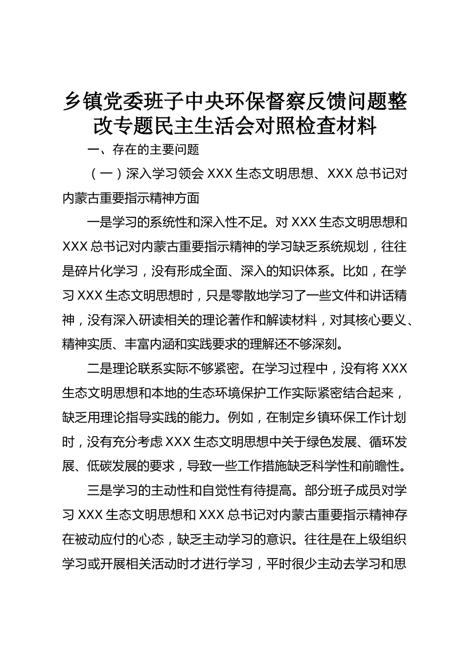 鄉(xiāng)鎮(zhèn)黨委班子中央環(huán)保督察反饋問題整改專題民主生活會對照檢查材料一、存在的主要問題(一)深入學習領會XXX生態(tài)文明思想、XXX總書記對內(nèi)蒙古重要指示精神方面一是學習的系統(tǒng)性和深入性不足。對XXX生態(tài)文明思想和XXX總書記對內(nèi)蒙古重要指示精神的學習缺乏系統(tǒng)規(guī)劃,往往是碎片化學習,沒有形成全面、深入的知識體系。比如,在學習XXX生態(tài)文明思想時,只是零散地學習了一些文件和講話精神,沒有深入研讀相關的理論著作和解讀材料,對其核心要義、精神實質(zhì)、豐富內(nèi)涵和實踐要求的理解還不夠深刻。二是理論聯(lián)系實際不夠緊密。在學習過程中,沒有將XXX生態(tài)文明思想和本地的生...