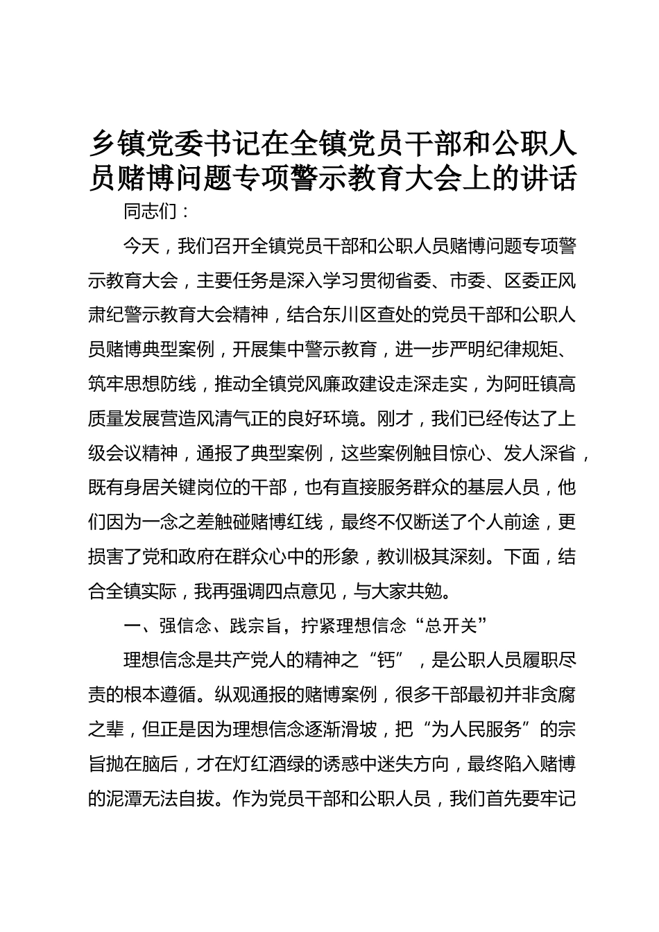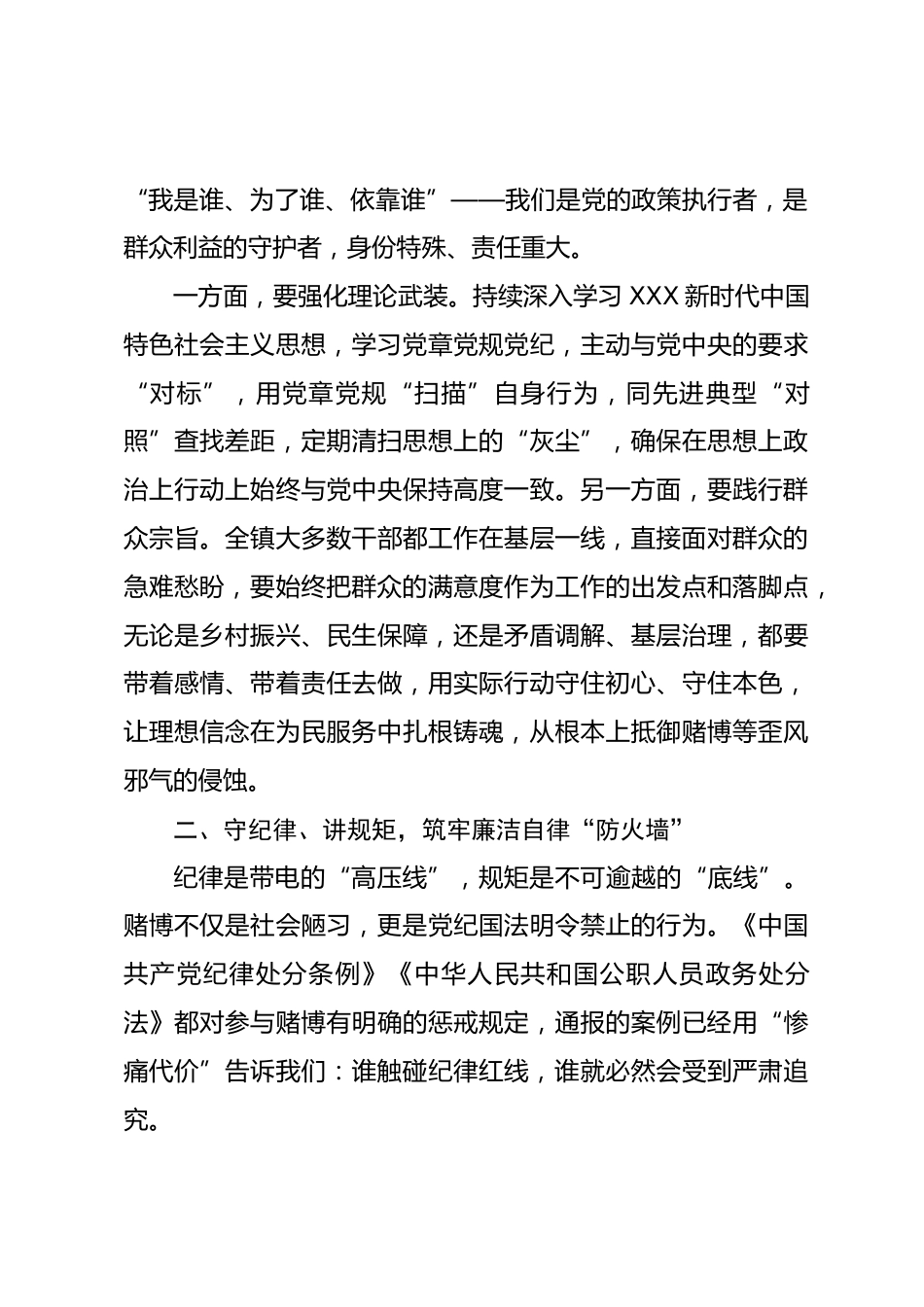 鄉(xiāng)鎮(zhèn)黨委書記在全鎮(zhèn)黨員干部和公職人員賭博問題專項警示教育大會上的講話