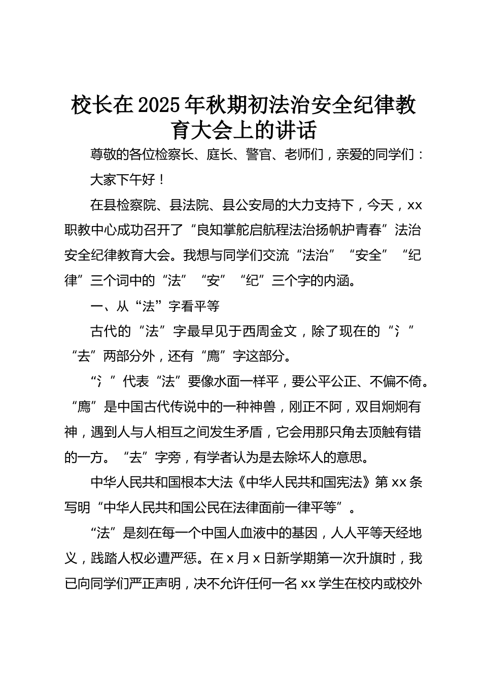 校長在2025年秋期初法治安全紀(jì)律教育大會上的講話